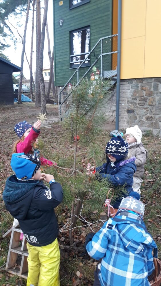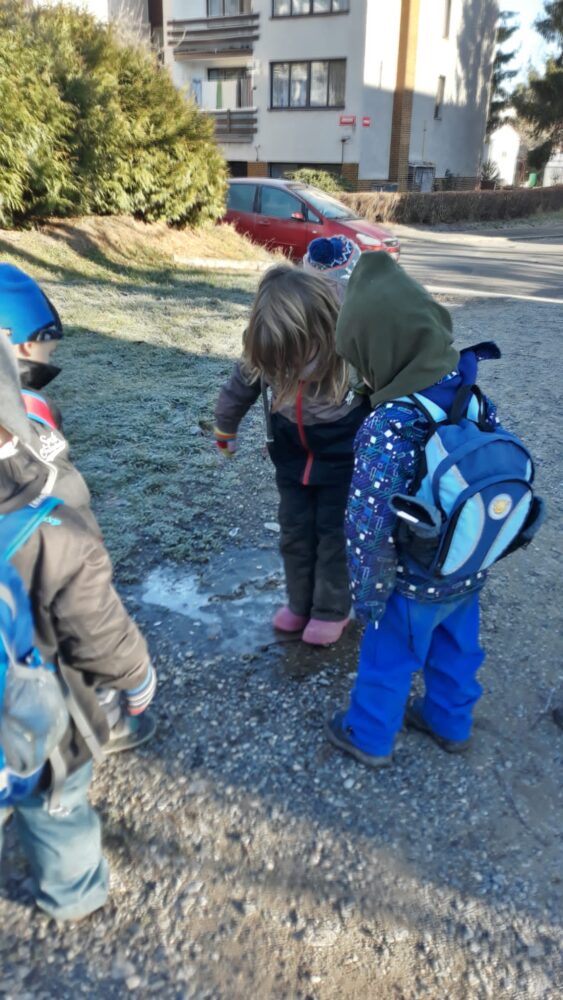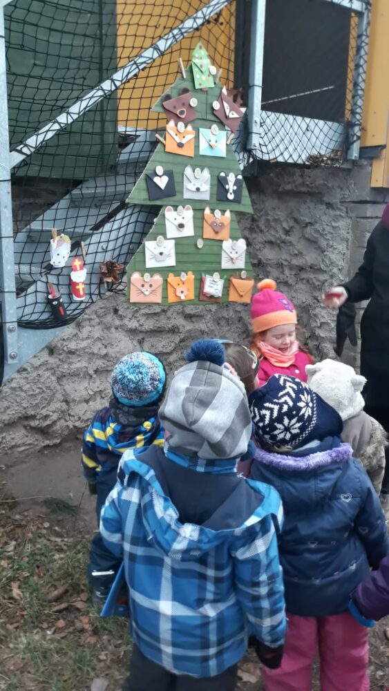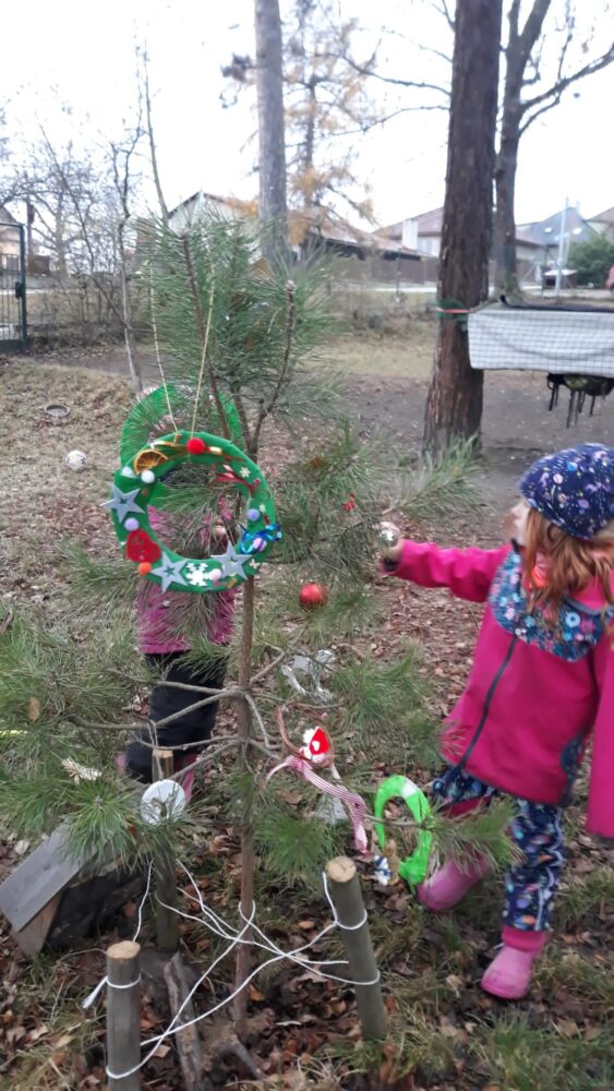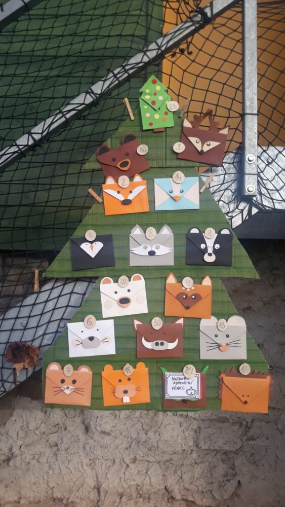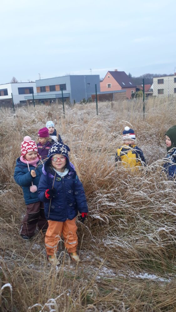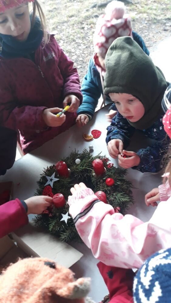 Předvánoční čas jsme začali u našeho adventního kalendáře s úkolem „nazdobit adventní věnec“ a uhádnout vánoční hádanku. Než jsme se dali do zdobení, vydali jsme se nejdřív na procházku, kde jsme pozorovali všude kolem nás námrazu, zamrzlé louže nebo trochu napadaného sněhu na plotech, po kterém se dalo malovat a psát. Došli jsme na „náš“ pozemek, na kterém si děti užívaly bludiště ve vysoké zamrzlé trávě. Po návratu do zahrady jsme společně nazdobili adventní věnec, u kterého jsme se pak společně sešli, zapálili první svíčku, zazpívali si Rolničky a přenesli jsme se tak do krásného adventního období. V zahradě si také děti zahrály hmatovou hru tak, že z přikrytého košíku vytahovaly různé vánoční symboly, kterými pak spontánně nazdobily malou borovičku 😊. Odpolední čas děti zakončily výrobou krásných adventních věnců na dveře.