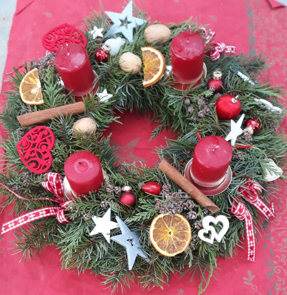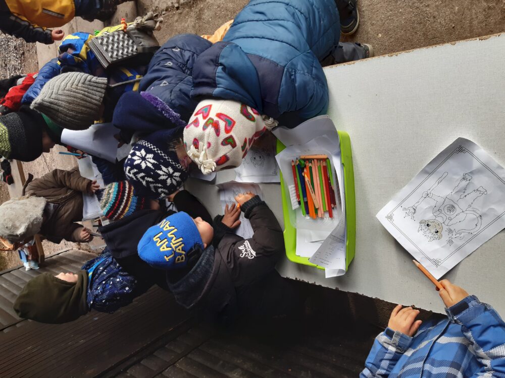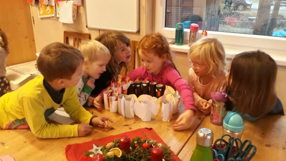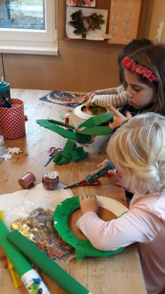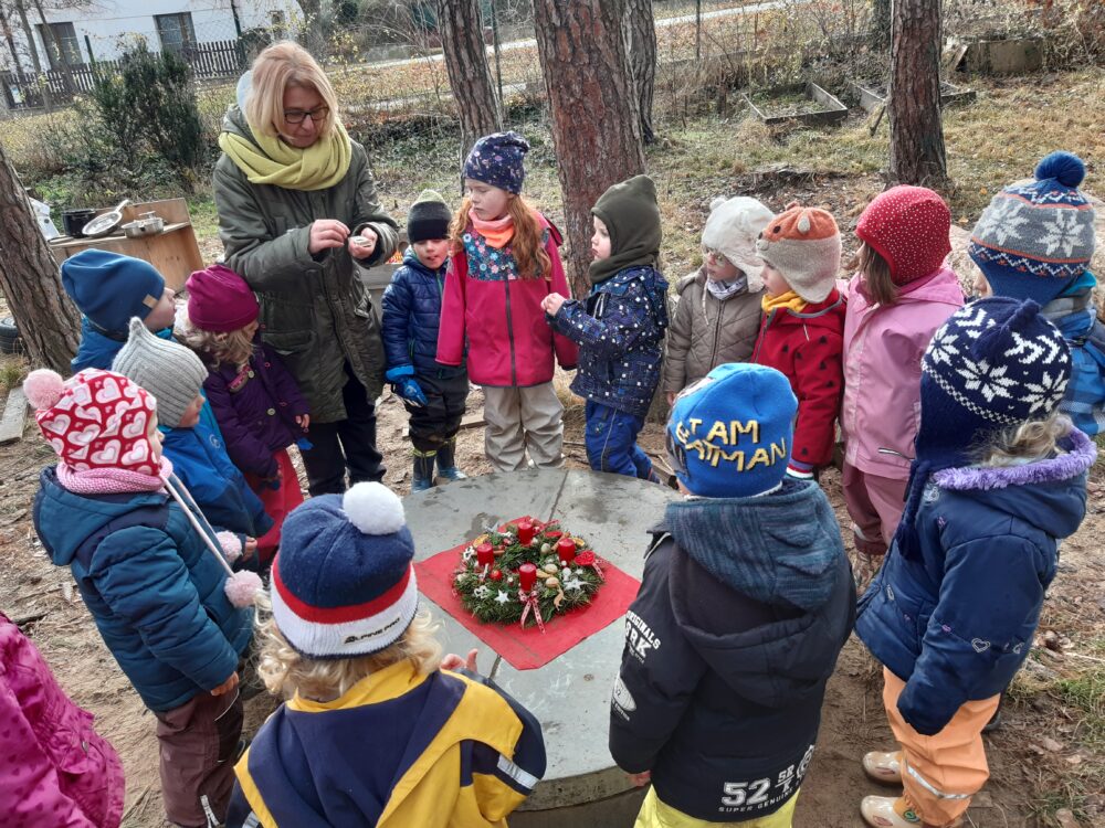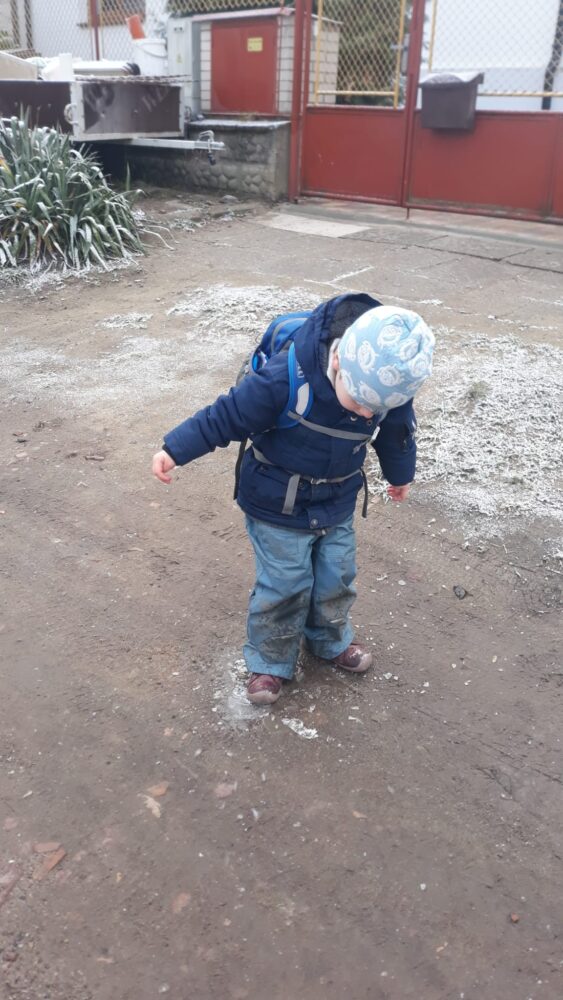 Předvánoční čas jsme začali u našeho adventního kalendáře s úkolem „nazdobit adventní věnec“ a uhádnout vánoční hádanku. Než jsme se dali do zdobení, vydali jsme se nejdřív na procházku, kde jsme pozorovali všude kolem nás námrazu, zamrzlé louže nebo trochu napadaného sněhu na plotech, po kterém se dalo malovat a psát. Došli jsme na „náš“ pozemek, na kterém si děti užívaly bludiště ve vysoké zamrzlé trávě. Po návratu do zahrady jsme společně nazdobili adventní věnec, u kterého jsme se pak společně sešli, zapálili první svíčku, zazpívali si Rolničky a přenesli jsme se tak do krásného adventního období. V zahradě si také děti zahrály hmatovou hru tak, že z přikrytého košíku vytahovaly různé vánoční symboly, kterými pak spontánně nazdobily malou borovičku 😊. Odpolední čas děti zakončily výrobou krásných adventních věnců na dveře.