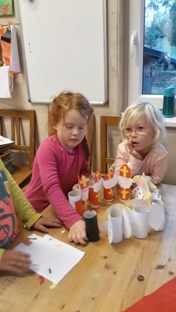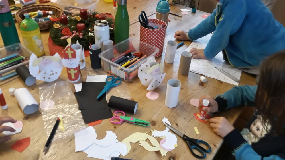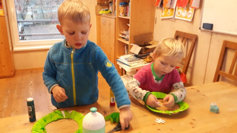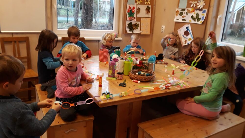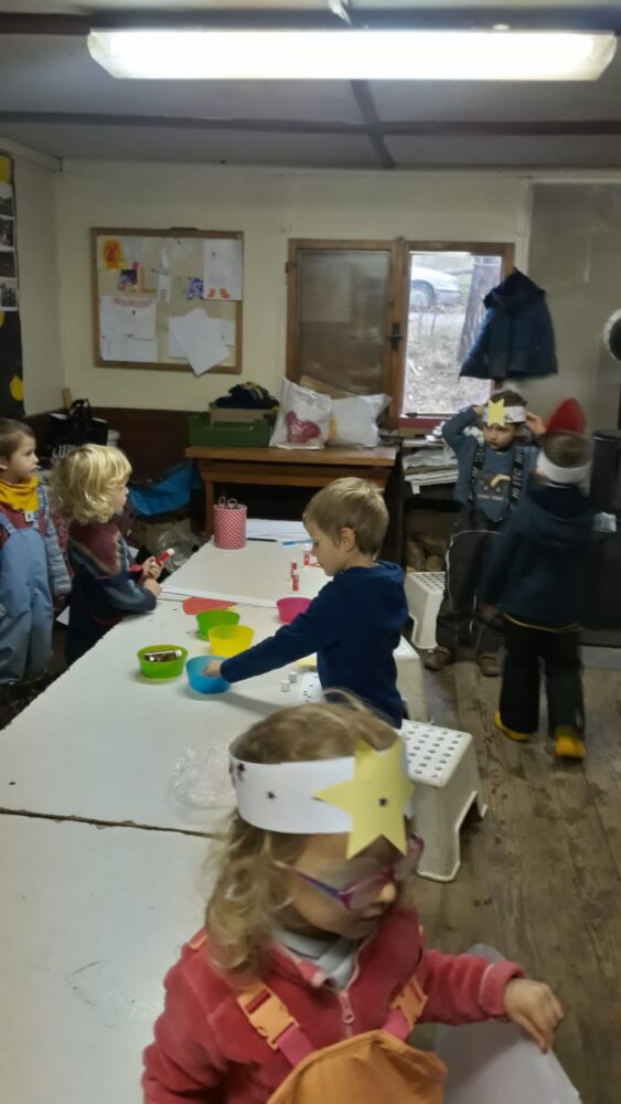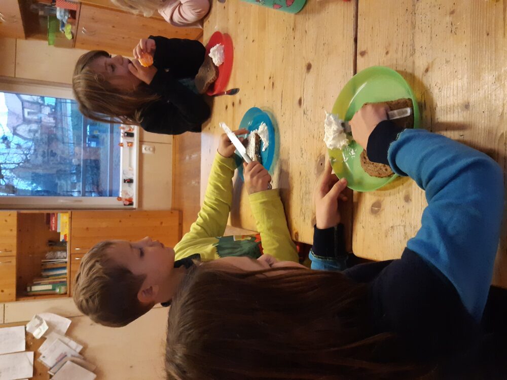 Úterní den jsme se opět sešli u adventního kalendáře. A protože se blížil čas Mikuláše, bylo dnešním úkolem naučit se písničku „Mikuláš ztratil plášť“. Pak jsme se šli projít mezi bytovky, kde jsme si společně zahráli Na mrazíka nebo děti válely sudy, anebo si hrály na domečky ve křoví. Odpoledne byl čas na mikulášské tvoření. Děti rády tvoří, a tak se sešlo hodně Mikulášů, andělů a čertů. Paráda! Odpolední svačina byla opět ve znamení samostatné přípravy. Tentokrát si děti umíchaly pomazánku z čerstvého sýra a nastrouhané mozzarelly, kterou si pak mazaly na slunečnicový chléb. Prima svačinka, u které nechyběly hrušky, jablka a mandarinky.