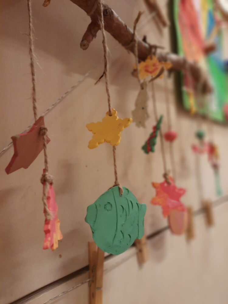 Ve čtvrtek na nás čekal v kalendáři úkol „ Andělsko-čertovská bojovka“. Vydali jsme se tedy do lesíka za státní školku, kde na nás již čekaly úkoly. Dozvěděli jsme se co dávají čerti do guláše, která zvířata mají kopyta jako čerti, nebo křídla jako andělé. Vyzkoušeli si blekotat jako čerti a přát si něco od anděla. Na konci cesty děti dostaly čertovské omalovánky, které si jim za plnění úkolů připadly právem. Odpoledne jsme se pustili do dokončení vánočního keramického závěsu do klubovny. Moc se dětem povedl a bude nám zdobit klubovnu minimálně do vánoc.