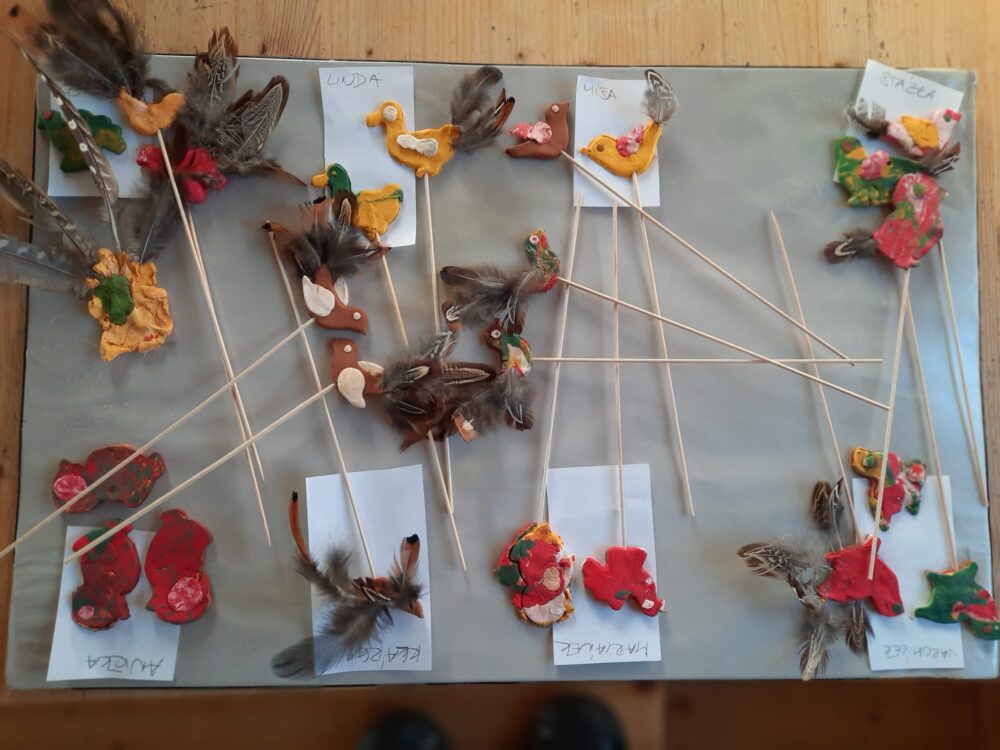 Čtvrteční dopoledne jsme věnovali hře „Na hlídače“, u které jsme si popovídali o vrabčácích. Na svačinku jsme se vydali ke skalám, kde jsme si s dětmi užívali sluníčka. Odpoledne jsme se věnovali tvoření z keramické hmoty – děti vytvořili řadu pestrobarevných opeřených ptáčků.