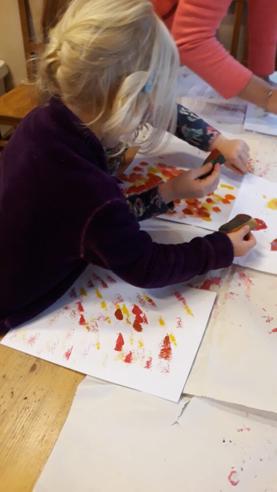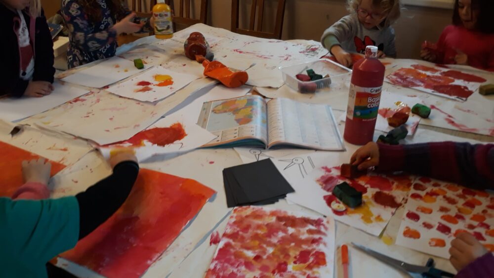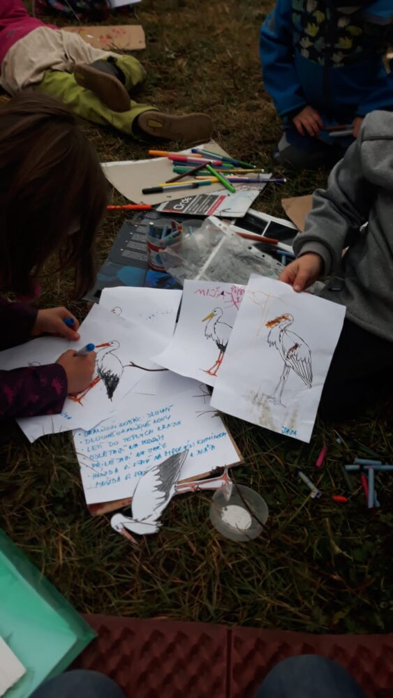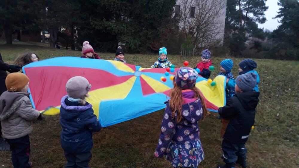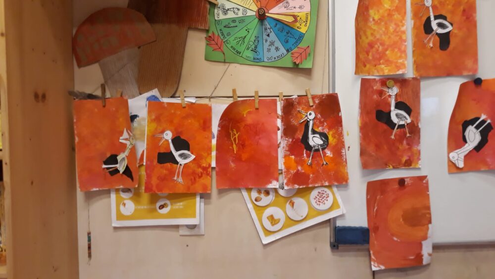 Další listopadové pondělí jsme začali nové téma, kterým jsou „ptáci v zimě“. Děti podle ranní pohybové hry „čáp ztratil čepičku“, ptačích hádanek a obrázků ptáčků jednoduše uhádly, na co si dnes a další dny budeme hrát. Dnes jsme připomněli prvního ptáka, který odletěl do teplých krajin – čápa bílého. Děti si čápa vybarvily, a přitom jsme si povídali a zapisovali, co všechno o něm víme. Pak jsme si ještě zahráli hru „čáp ztratil čepičku“, ale tentokrát s padákem. Po něm následovala hra „moře“ s balónky, u kterého si děti užily hodně zábavy. Po obědě si děti poslechly čapí příběh z knížky Já Baryk, pak jsme se podívali do atlasu světa, jak velká je Afrika oproti naší zemi a jak je to daleká cesta pro odlétající ptáky. Potom si děti takový podzimní obrázek s čápem v Africe ztvárnily. Nejvíce je bavilo barevné tupování houbičkou, ale poradily si i s vystřižením Afriky a čápa. Obrázky se dětem nakonec hodně povedly 😊.