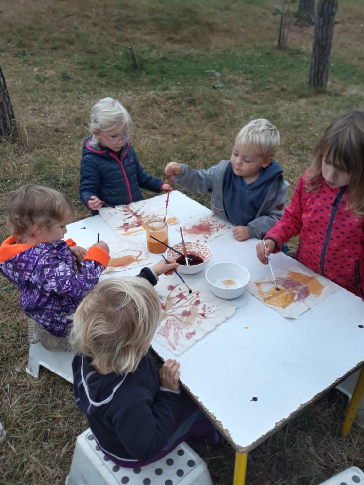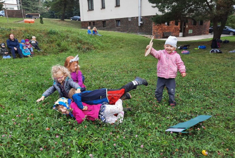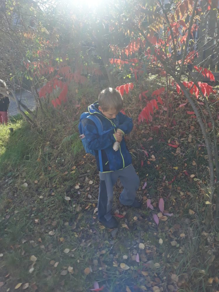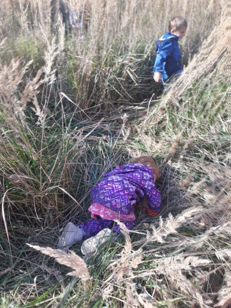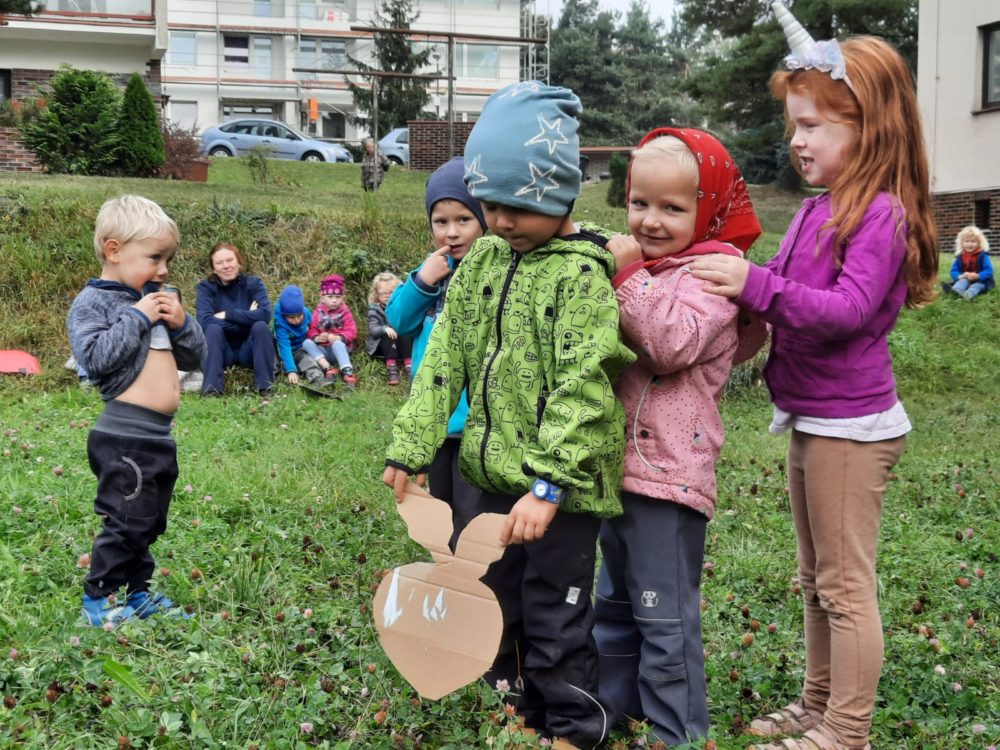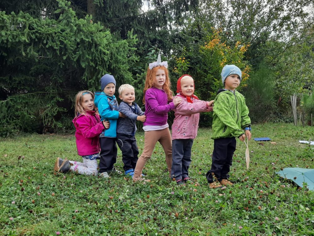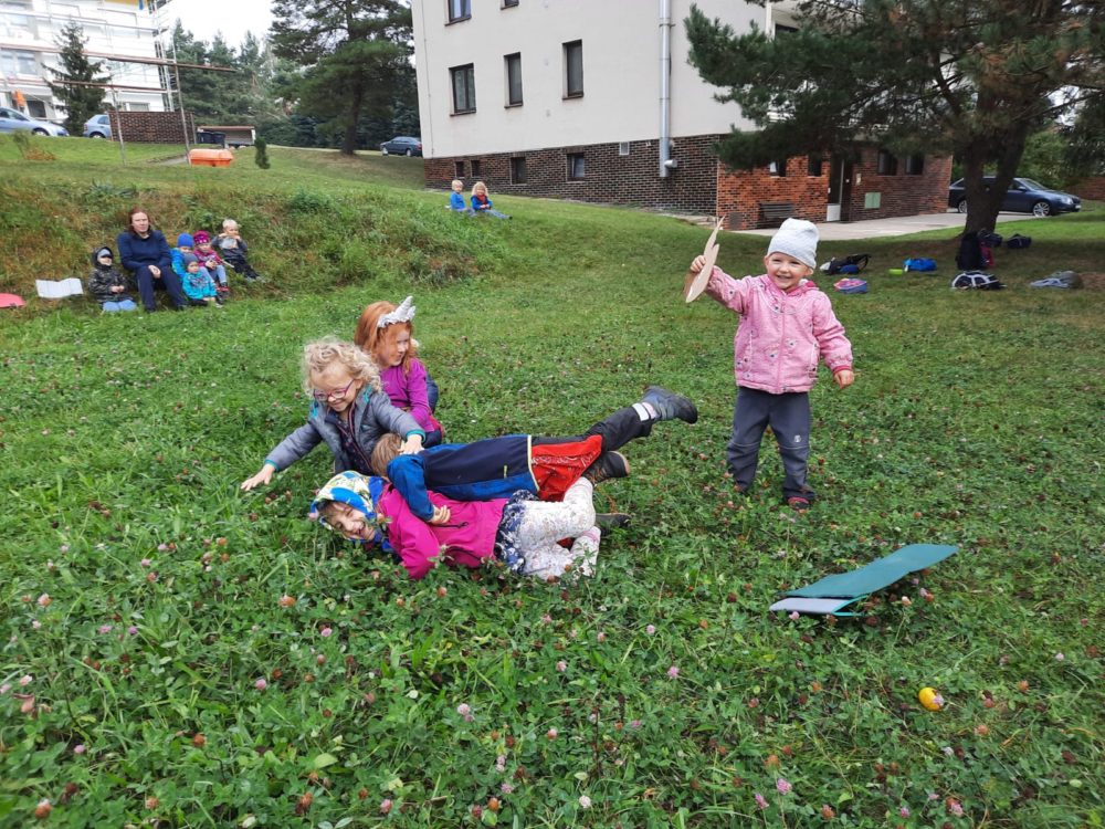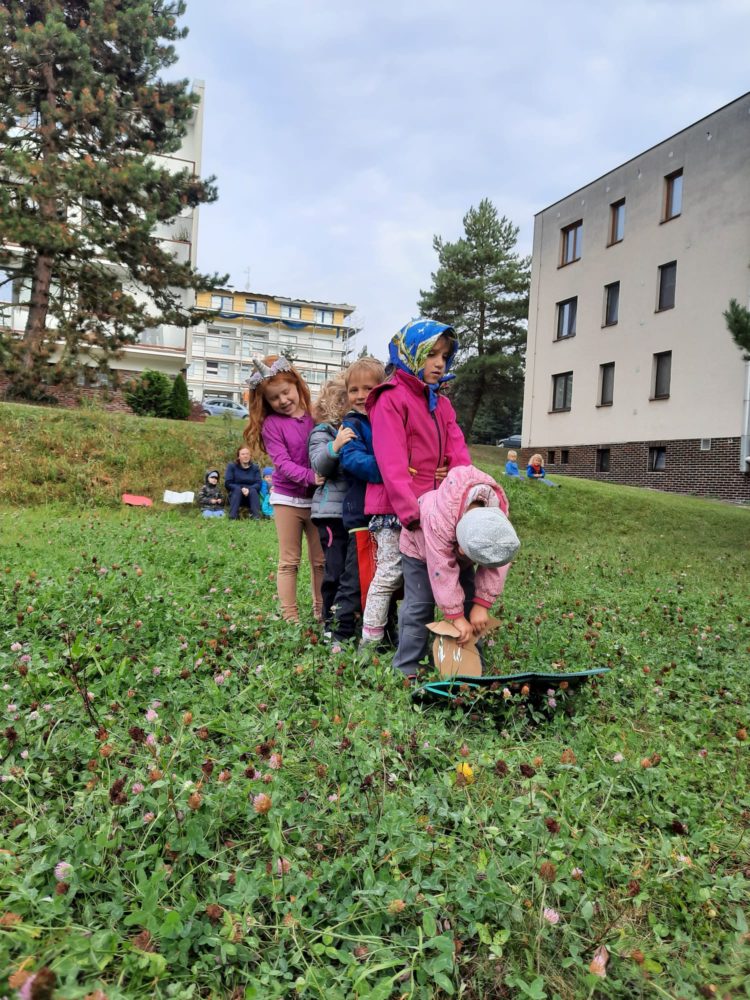 Poslední den v týdnu si děti pomalovaly krabičky na podzimní poklady, které si zavěsily kolem krku. Poklady jsme se vydali hledat cestou k naší „louži“. V krabičkách se objevovaly barevné květy rostlin, šípek, kamínky, peříčka, barevné listy nebo dokonce v ní našel úkryt jeden malý slimáček. U té naší louže si děti užívaly vysoké trávy, ze které si dělaly bludiště. Tvořily různé cestičky, běhaly v nich a nebyly skoro vidět. Zábava to tedy byla skvělá😊.