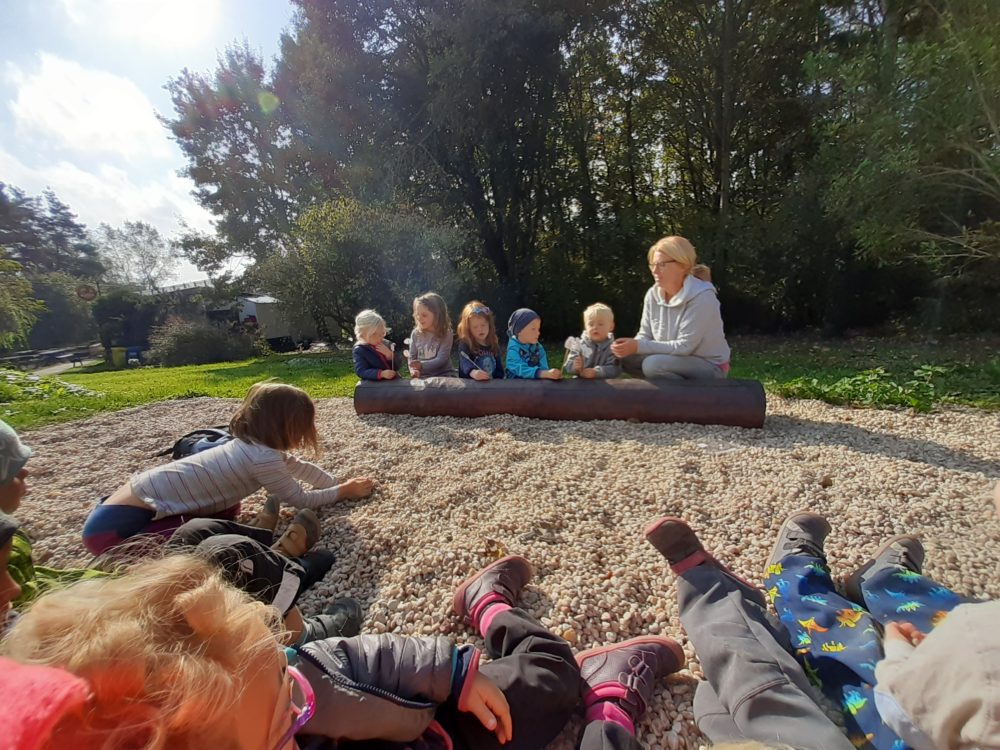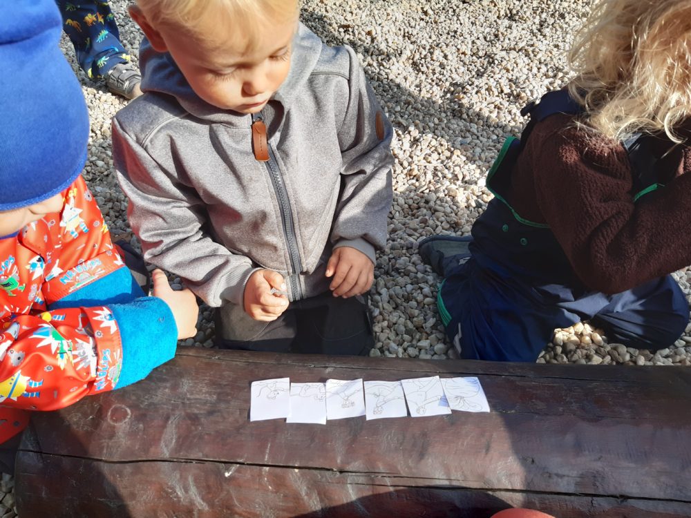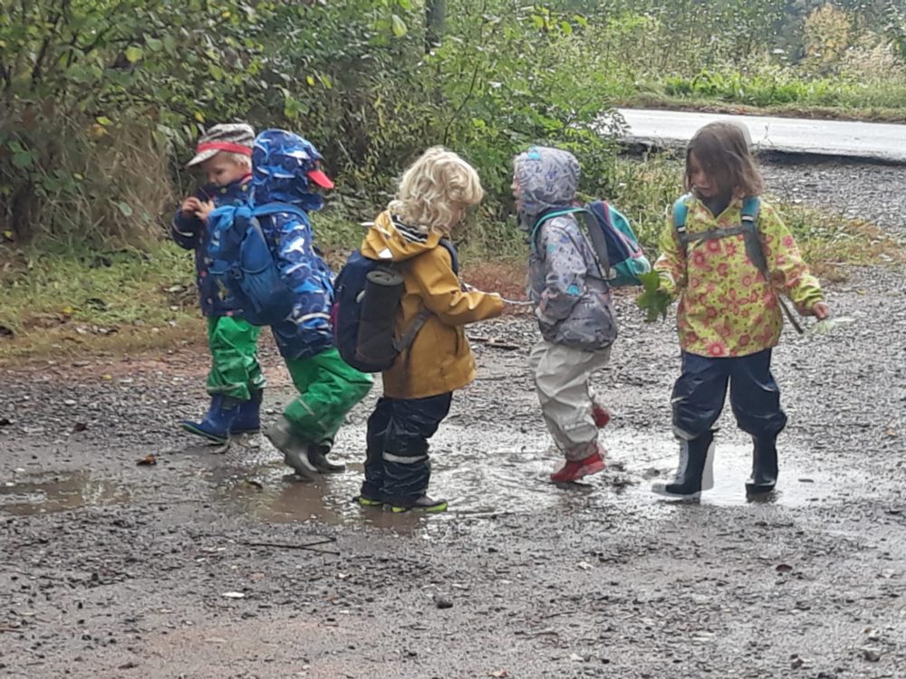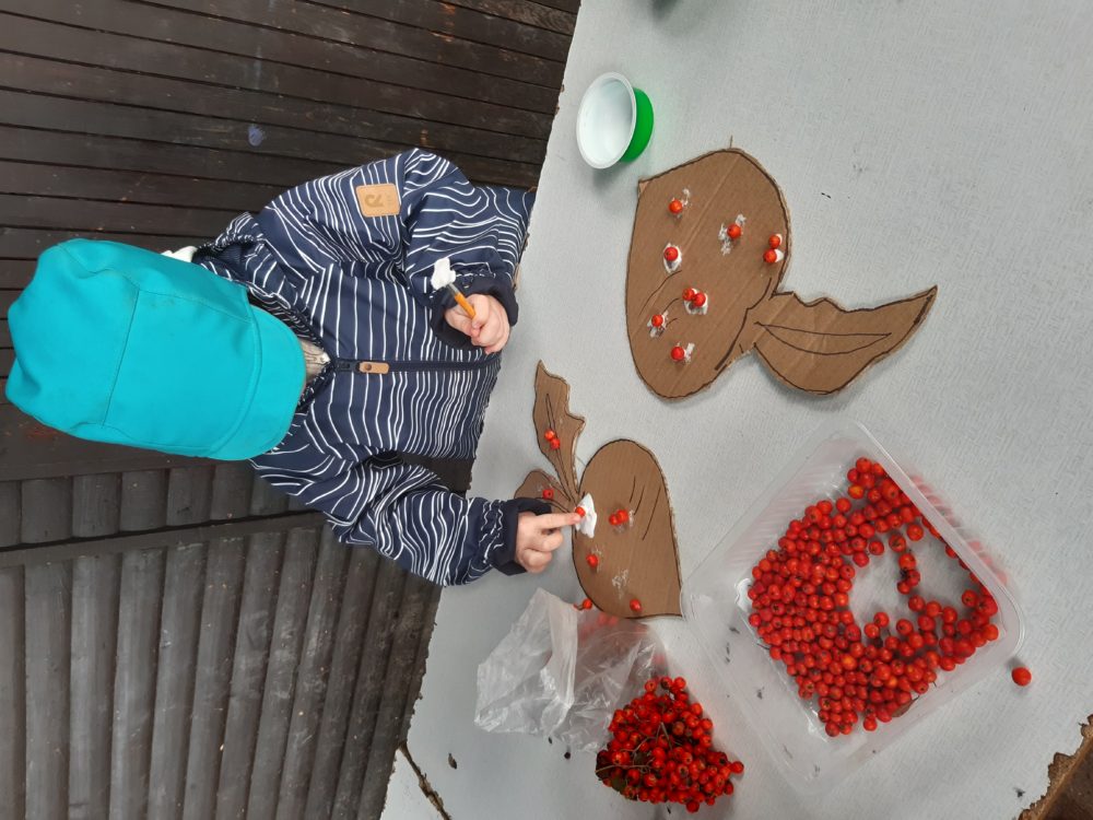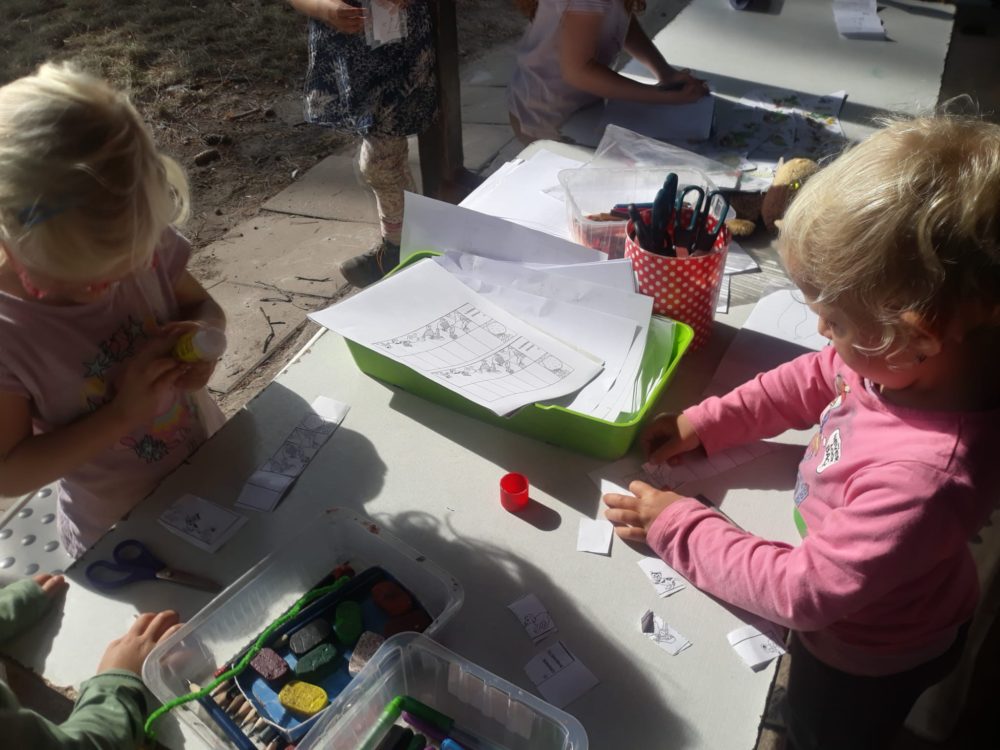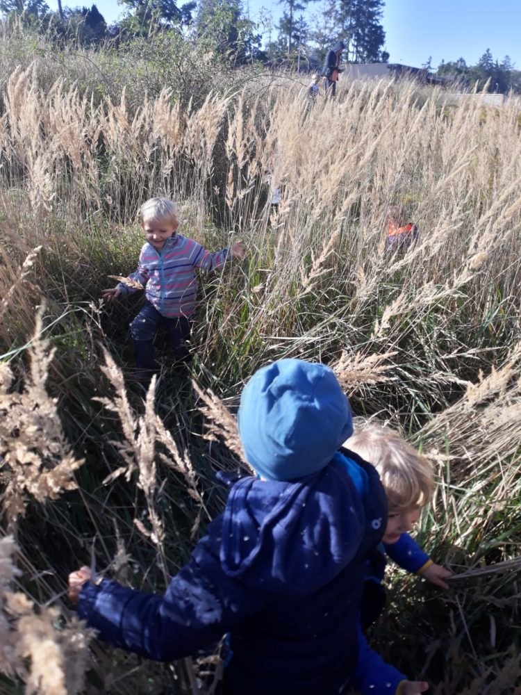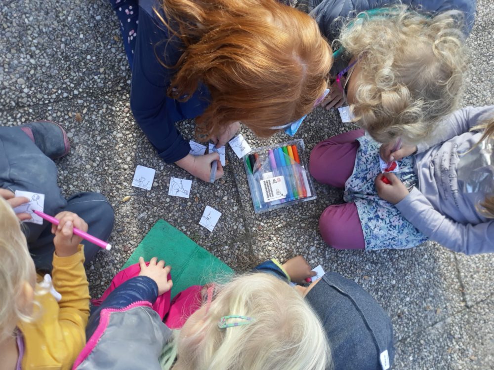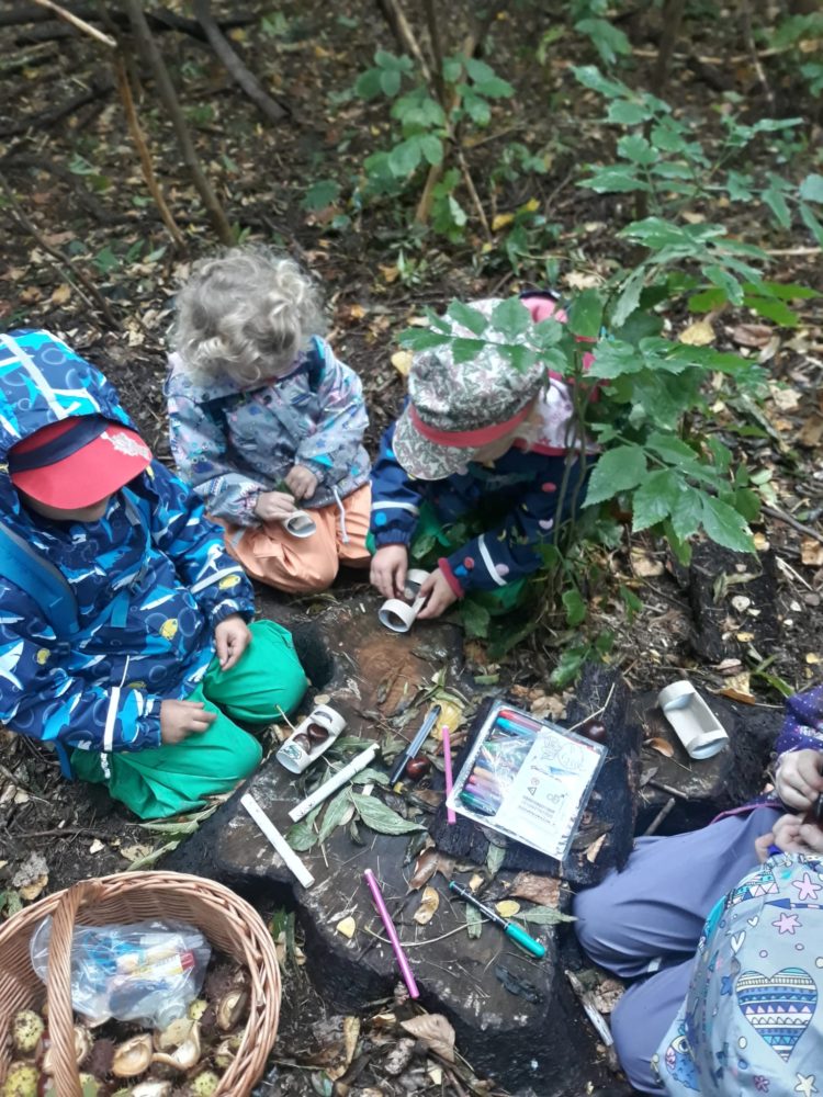 Poslední den v týdnu si děti pomalovaly krabičky na podzimní poklady, které si zavěsily kolem krku. Poklady jsme se vydali hledat cestou k naší „louži“. V krabičkách se objevovaly barevné květy rostlin, šípek, kamínky, peříčka, barevné listy nebo dokonce v ní našel úkryt jeden malý slimáček. U té naší louže si děti užívaly vysoké trávy, ze které si dělaly bludiště. Tvořily různé cestičky, běhaly v nich a nebyly skoro vidět. Zábava to tedy byla skvělá😊.