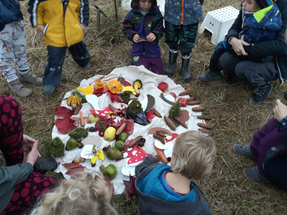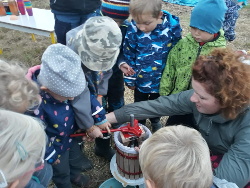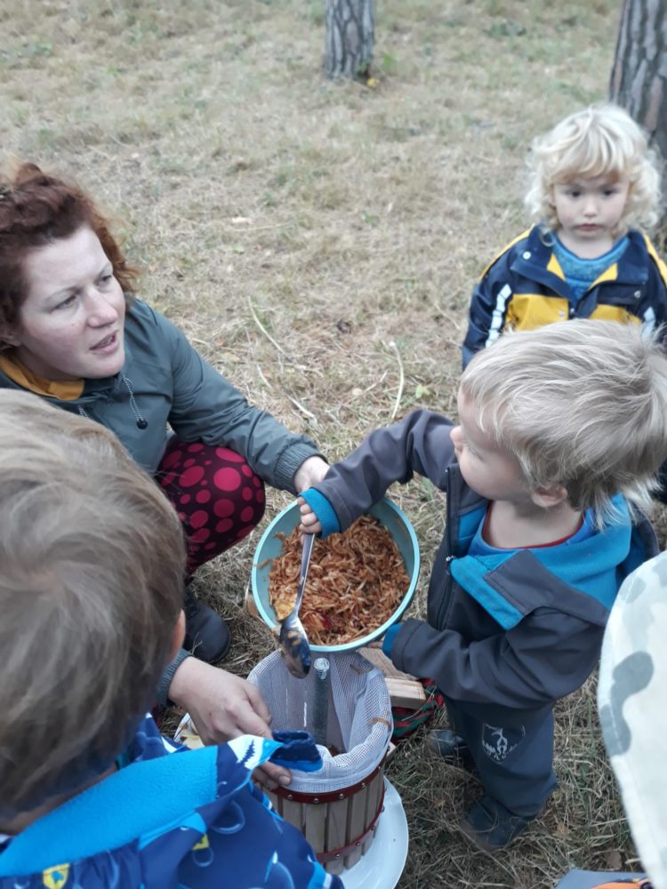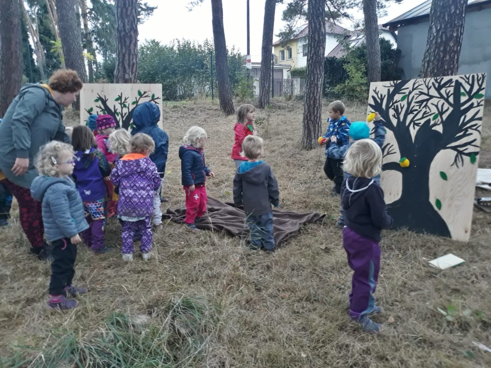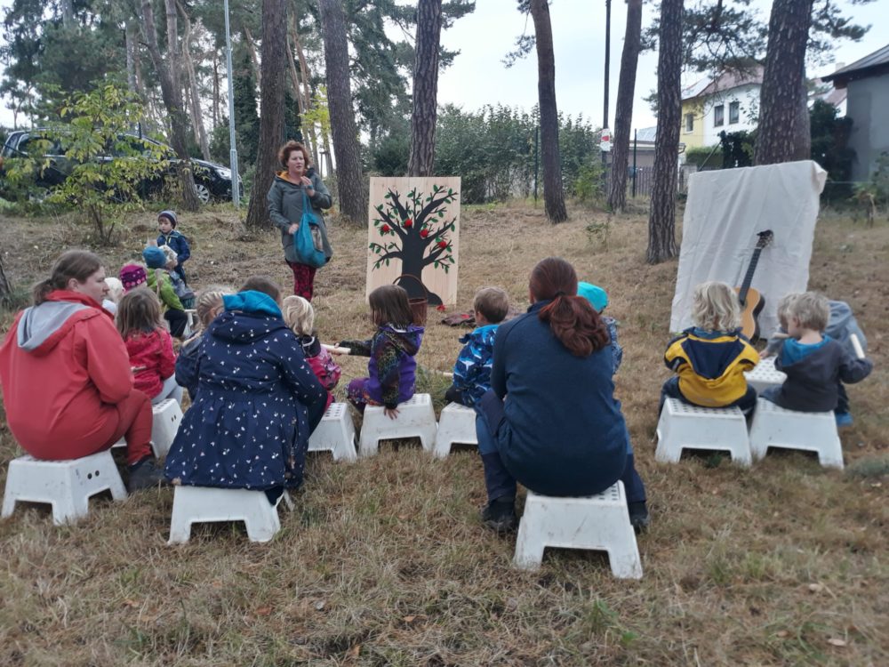Čtvrteční ráno se neslo v duchu očekávání divadla, které nás navštívilo v zahradě. Podzimní pohádka nám dala nahlédnout do tajů života jabloně, zpívalo se a hrálo na hudební nástroje. Součástí programu bylo malování na látku přírodními barvami (skořice, arónie, rakytník) a moštování jablek. Děti si pohádku i následné aktivity moc užily. Odpoledne jsme se z keramickou hlínou vrátily k jablkům a vytvořily si mističky na malé poklady.