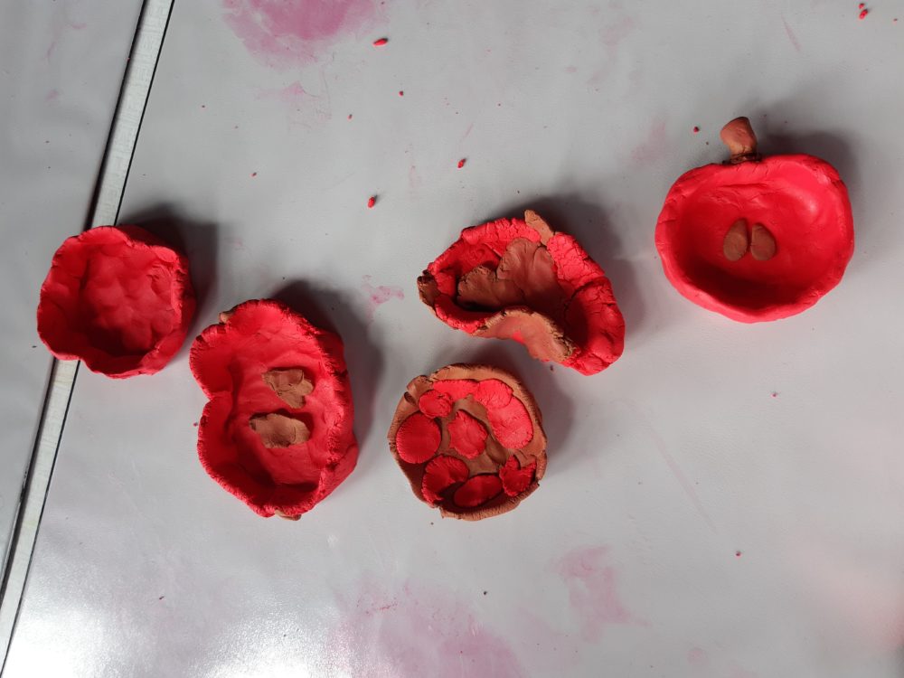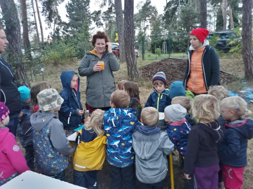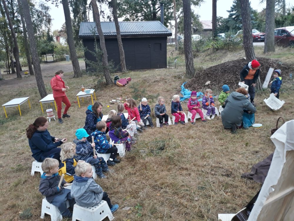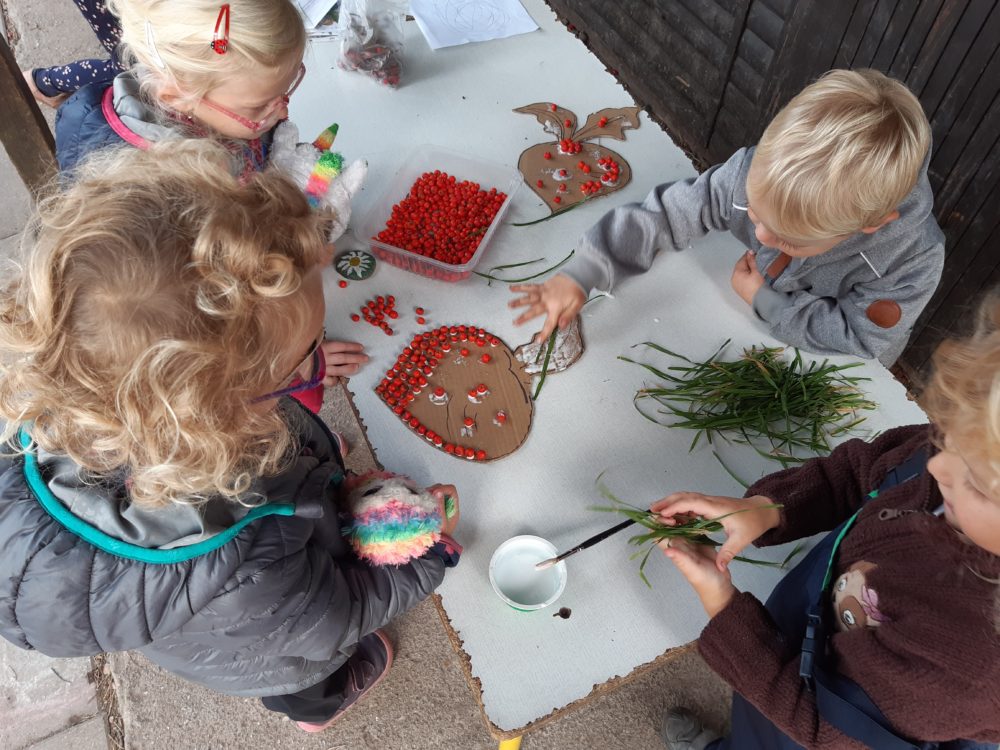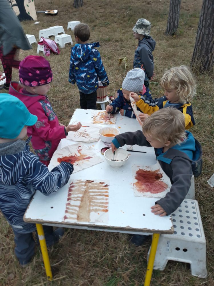 Čtvrteční ráno se neslo v duchu očekávání divadla, které nás navštívilo v zahradě. Podzimní pohádka nám dala nahlédnout do tajů života jabloně, zpívalo se a hrálo na hudební nástroje. Součástí programu bylo malování na látku přírodními barvami (skořice, arónie, rakytník) a moštování jablek. Děti si pohádku i následné aktivity moc užily. Odpoledne jsme se z keramickou hlínou vrátily k jablkům a vytvořily si mističky na malé poklady.