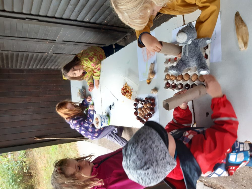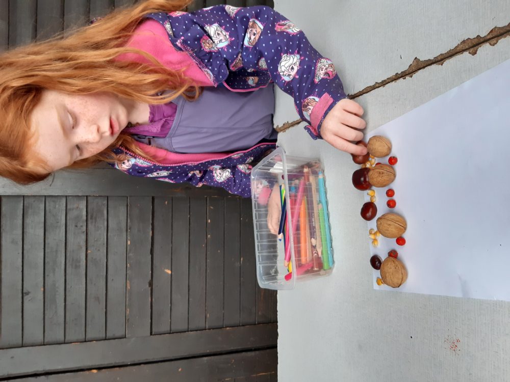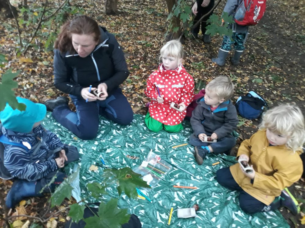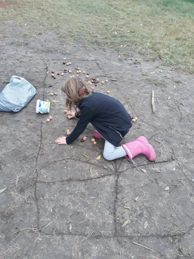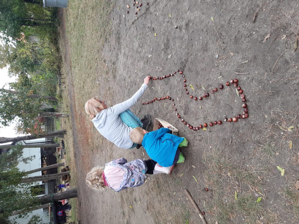 Středeční dopoledne bylo o veselém kaštánkování. Děti si nejdříve lesní cestou posbíraly „ztracené“ kaštany, kterým pak domalovaly obličej a ukládaly je do postýlek z ruliček od toaletního papíru nebo do kaštanové slupky. Některé děti pro ně dokonce dělaly ještě domečky z přírodnin. A protože z úterka na středu pršelo a my šli zrovna kolem louží, tak se v nich děti parádně vyřádily. Odpoledne jsme zůstali ještě u kaštanů, ke kterým jsme přidali ořechy, a děti z nich tvořily přírodní land art.
