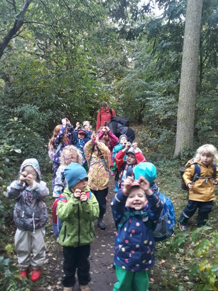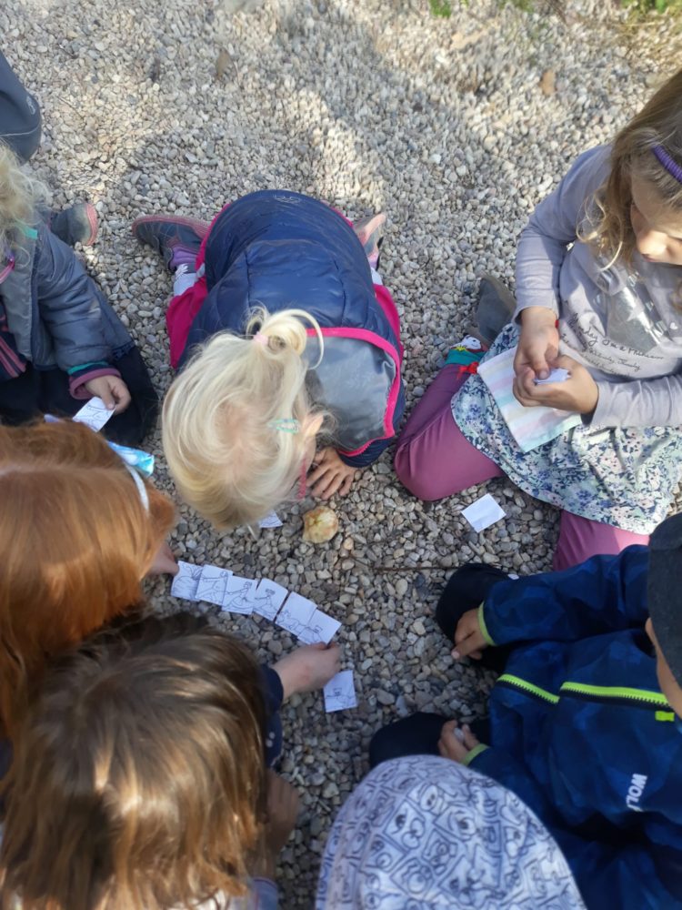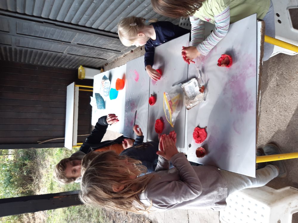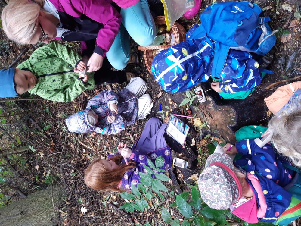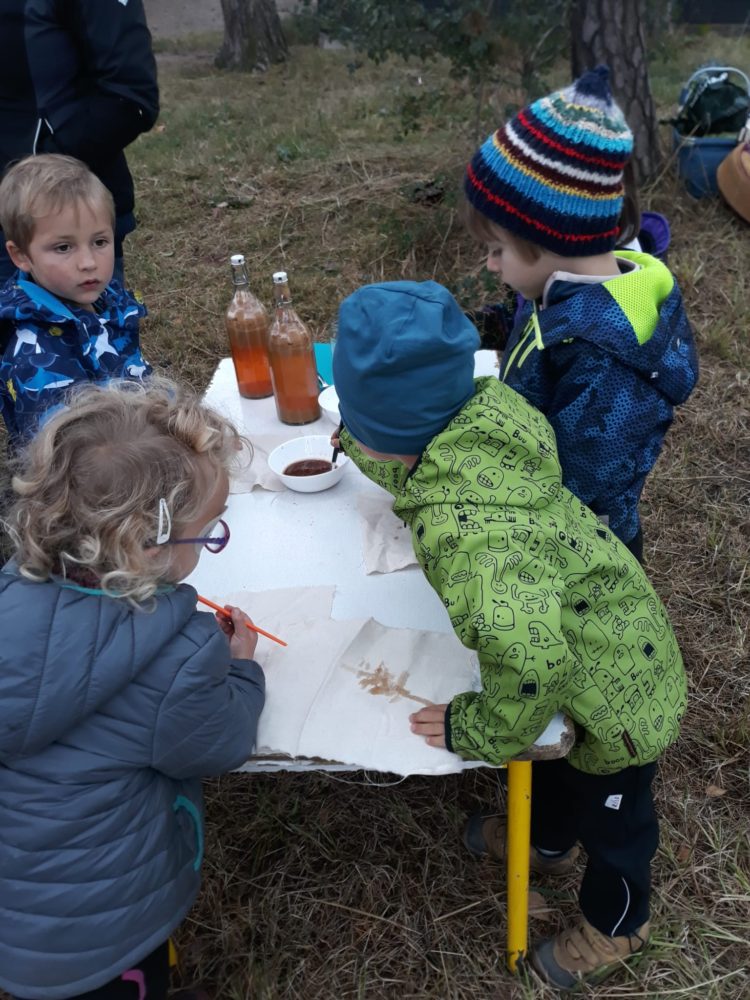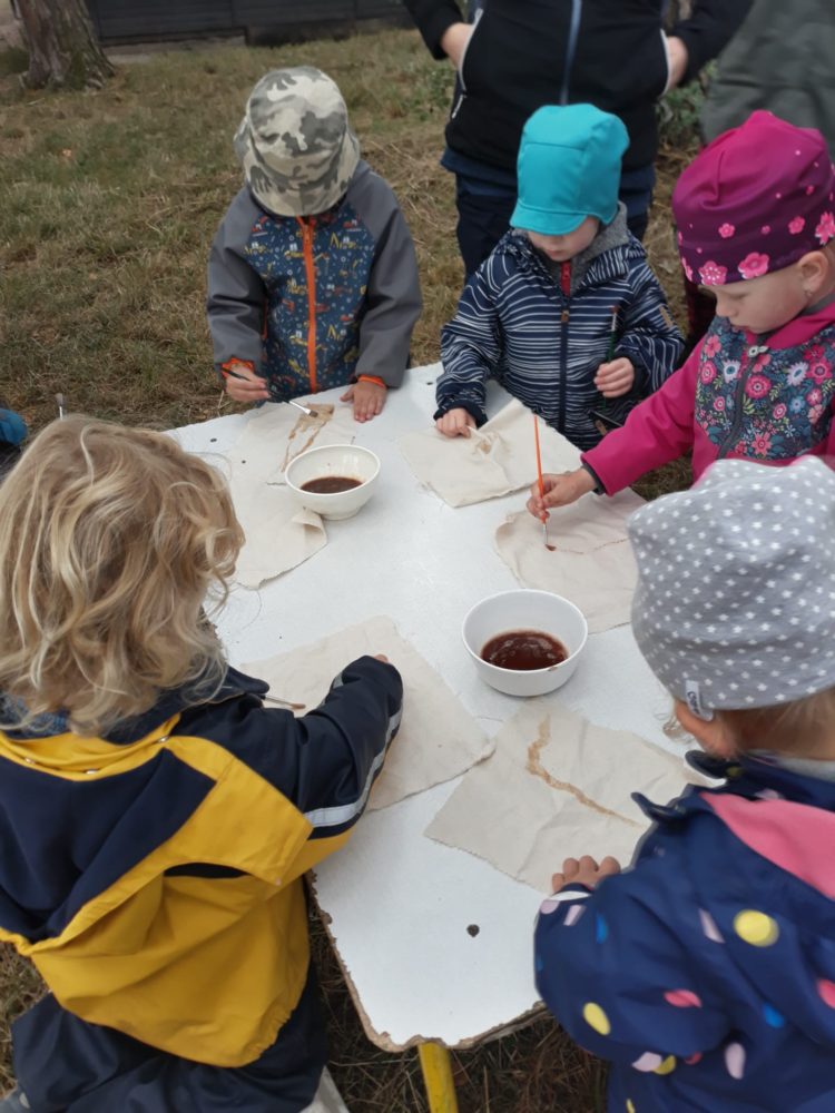 Středeční dopoledne bylo o veselém kaštánkování. Děti si nejdříve lesní cestou posbíraly „ztracené“ kaštany, kterým pak domalovaly obličej a ukládaly je do postýlek z ruliček od toaletního papíru nebo do kaštanové slupky. Některé děti pro ně dokonce dělaly ještě domečky z přírodnin. A protože z úterka na středu pršelo a my šli zrovna kolem louží, tak se v nich děti parádně vyřádily. Odpoledne jsme zůstali ještě u kaštanů, ke kterým jsme přidali ořechy, a děti z nich tvořily přírodní land art.