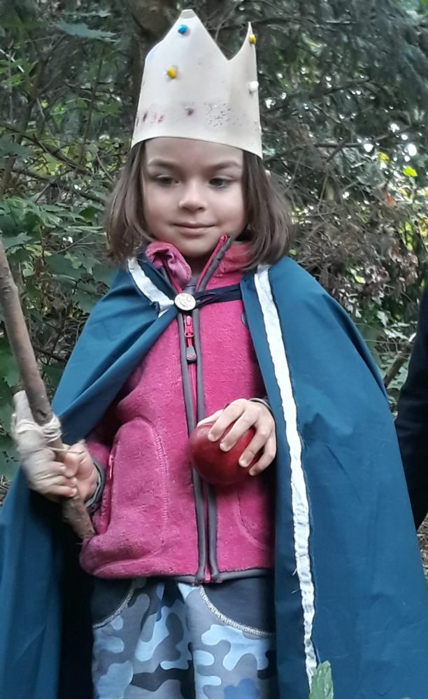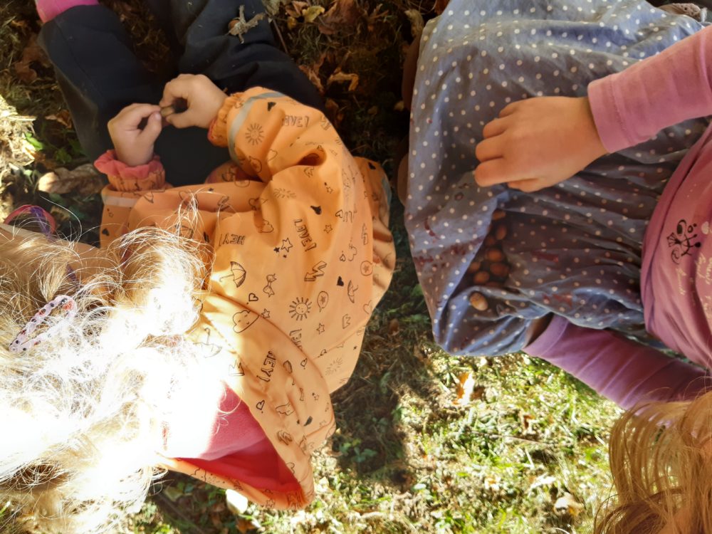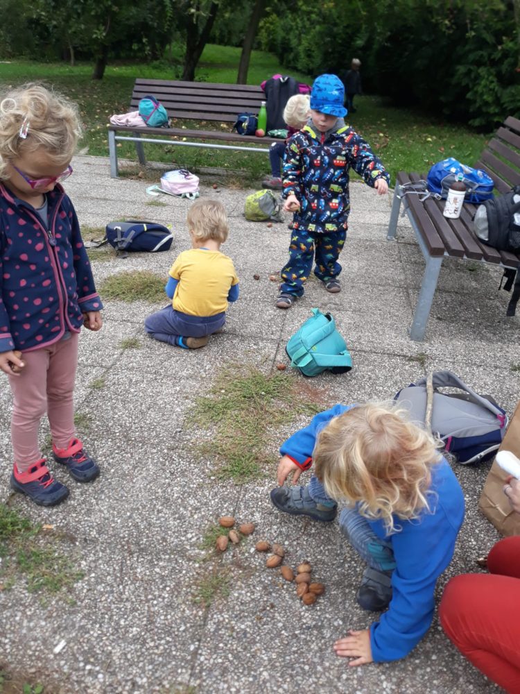 V pondělí jsme pokračovali v objevování podzimních darů přírody. Kroky nás tentokrát vedly k ořešákům blízko horolezeckých stěn. Vlašských ořechů jsme si nejdříve nasbírali plné ruce a kapsy, pak jsme je louskali a vychutnávali si jejich jádra. Nato jsme se vrátili do školky, abychom si pověděli o zítřejším svátku sv. Václava, o jeho dávném příběhu a vyrobili si královské koruny. Před obědem jsme se ještě sešli u podzimního kalendáře, kam děti doplnily dnešní podzimní odznak, který získali za loupání ořechů. Doplnili jsme i odznak za sbírání hub, které proběhlo v prvních školkových dnech. Odpoledne si děti převáženě kreslily a některé pomáhaly tvořit věneček ze skořápek ořechů.