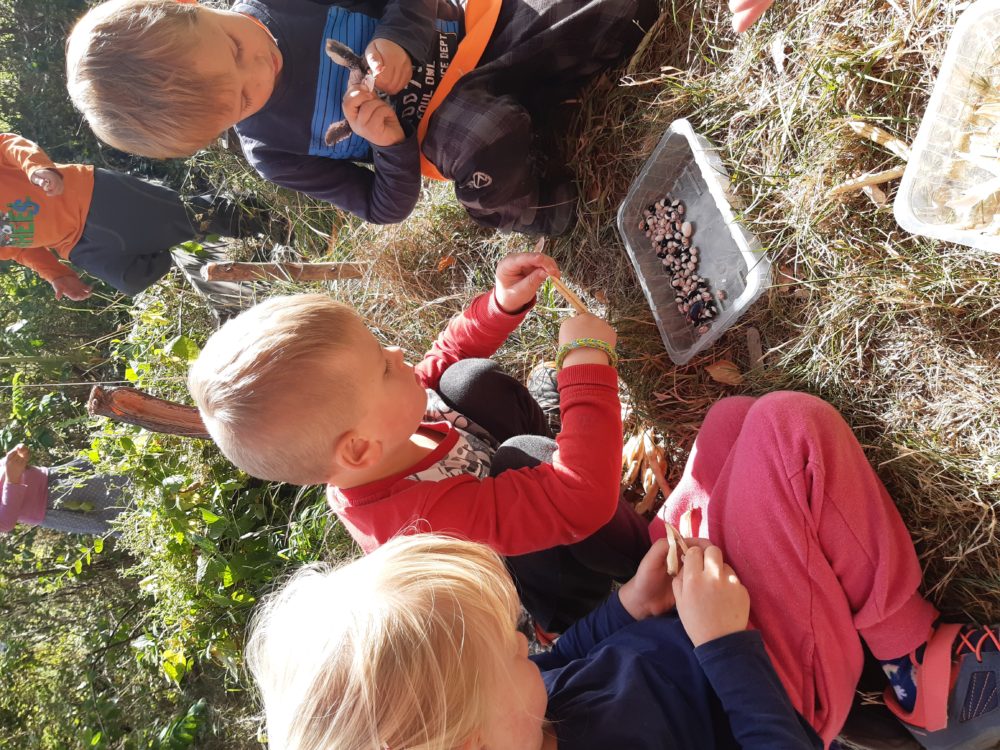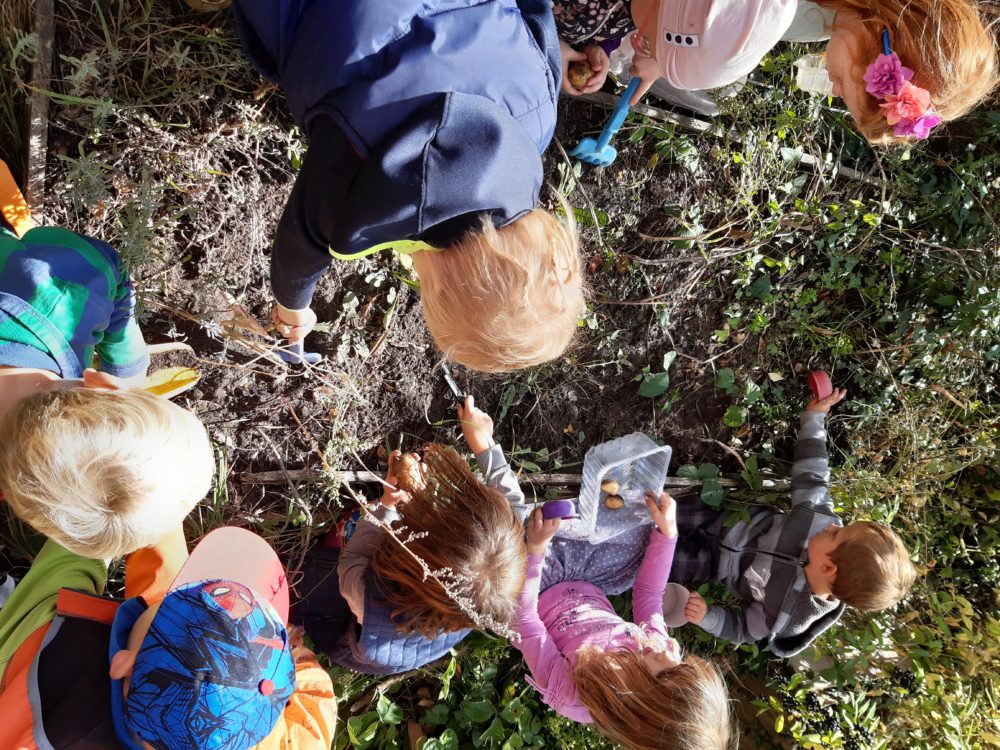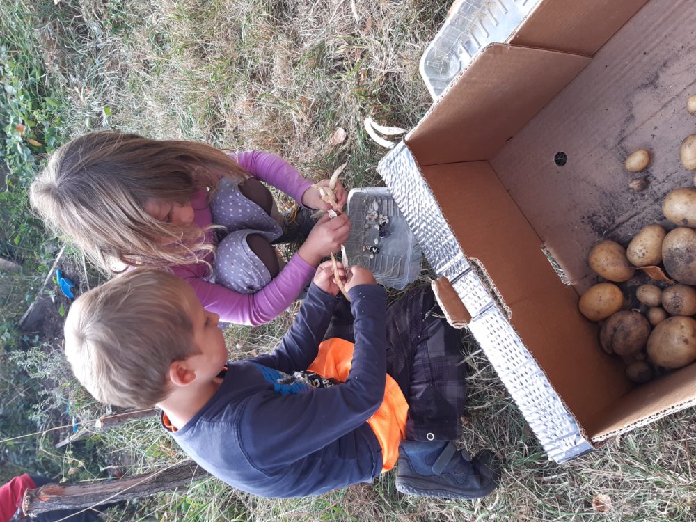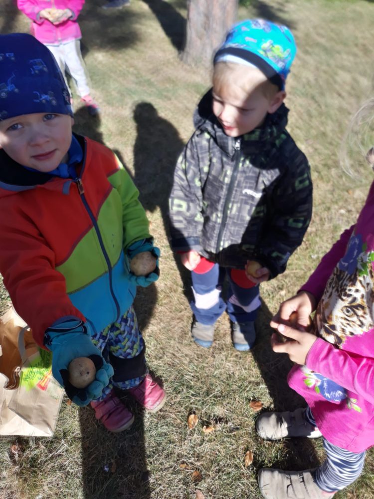 Čtvrteční slunečný den jsme odstartovali výpravou na hřiště do Pařeziny. Děti si užívaly prolézačky, pískoviště i „lanovku“, objevily lískové i vlašské ořechy. Po návratu do zahrady jsme odstartovali sklizeň brambor, které jsme v minulém roce s dětmi zasadily do záhonu. Všichni se do vykopávání vrhly se vší vervou a moc je to bavilo. Po obědě jsme sklidili ještě i fazole. Jejich loupání bylo plné překvapení – zkoumali jsme barvy, tvary i velikost, porovnávali je a zkoušeli odhadovat, jaká fazole na nás v lusku čeká.