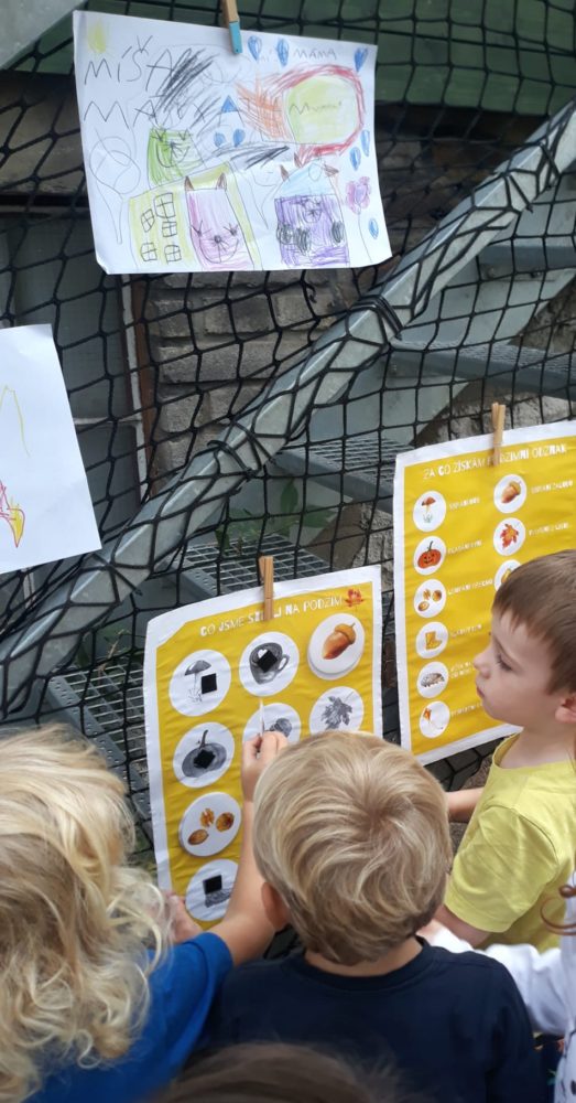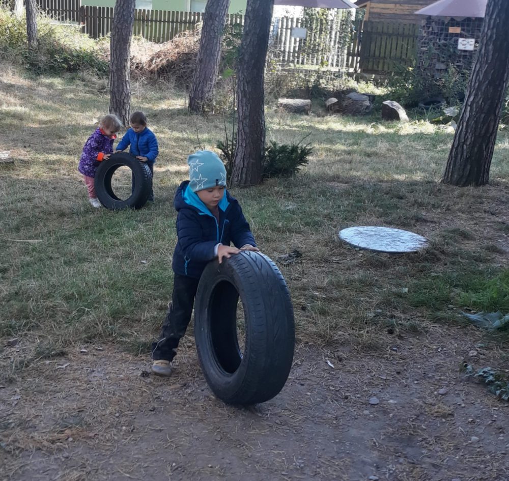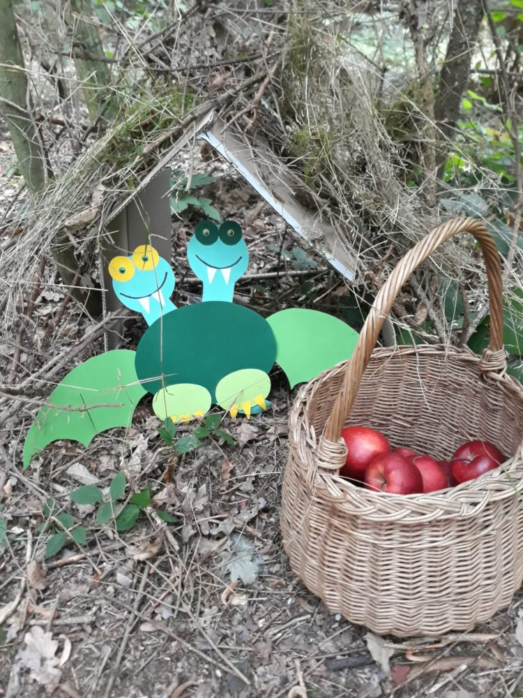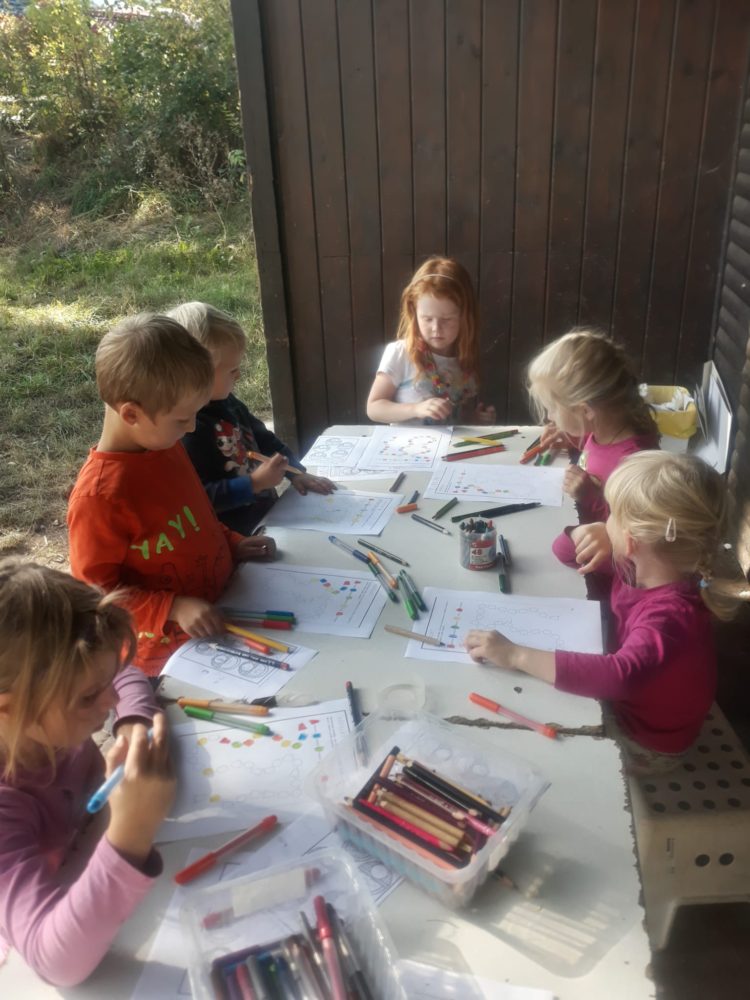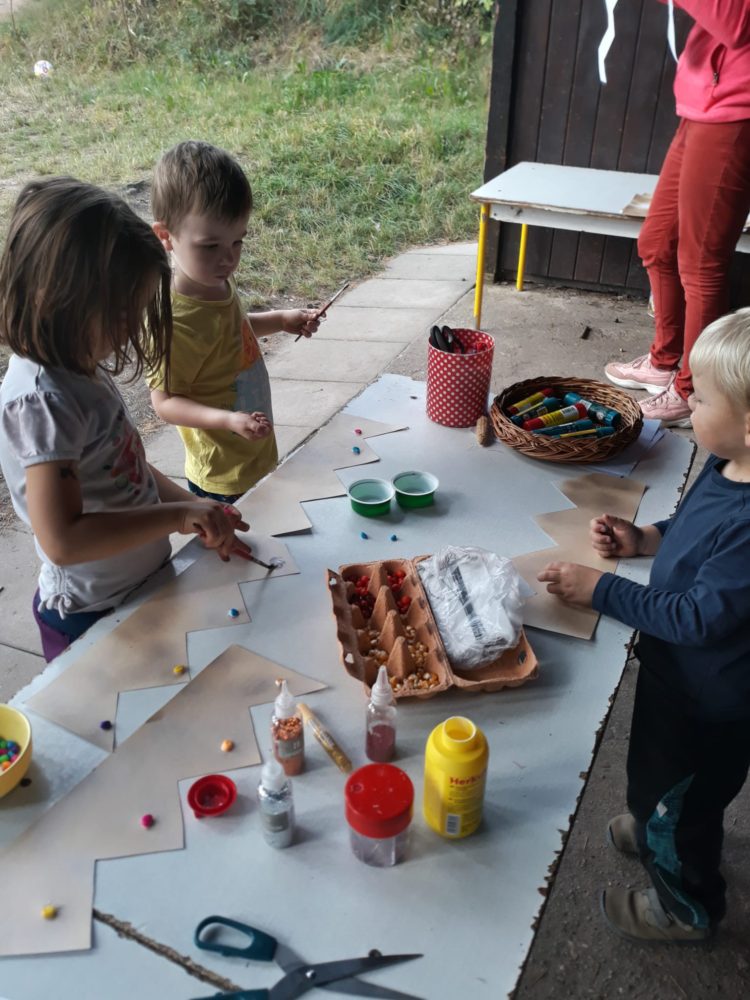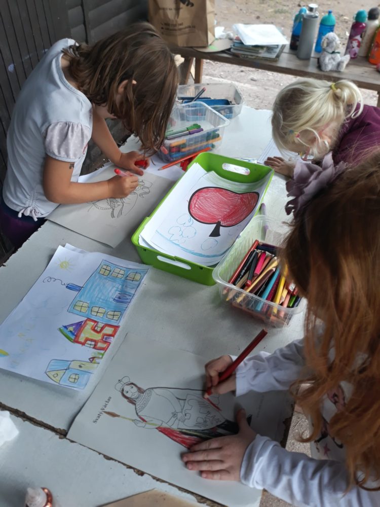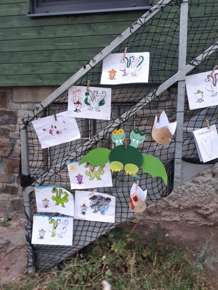 Středa byla ve znamení svatomichaelské stezky odvahy. Již po druhé jsme obnovili pradávnou tradici sv. Michaela, který je pro toto podzimní období symbolem odvážného rytíře bojujícího s drakem a symbolem podzimních plodů, které nás v těchto dnech posílí. Na samotného draka jsme si připravovali od samého rána, kdy jsme si o něm povídali ve vztahu k pohádkám o princeznách a drakovi. Před samotnou cestou k hodnému drakovi si děti vyslechly pohádku O drakovi, který měl rád brambory, a přitom si ho na omalovánce vybarvovaly. Potom se postupně naši malí stateční rytíři vydali cestou lemovanou dračím ohněm k dráčkovi, u kterého si vzali z košíku jablko a vrátili se stejnou cestou zpět. Děti měly radost nejen z toho, že stezku odvahy zvládly projít, ale líbil se jim i dráček a možnost vzít si jablko, kterým se nakonec posilnily. Po obědě jsme si odpočinuli u čtených pohádek, zábavu jsme si užili při hře Škatulata batulata, hýbejte se a někteří si užívali při tvoření s jeřabinami nebo vaření v pískové kuchyni.