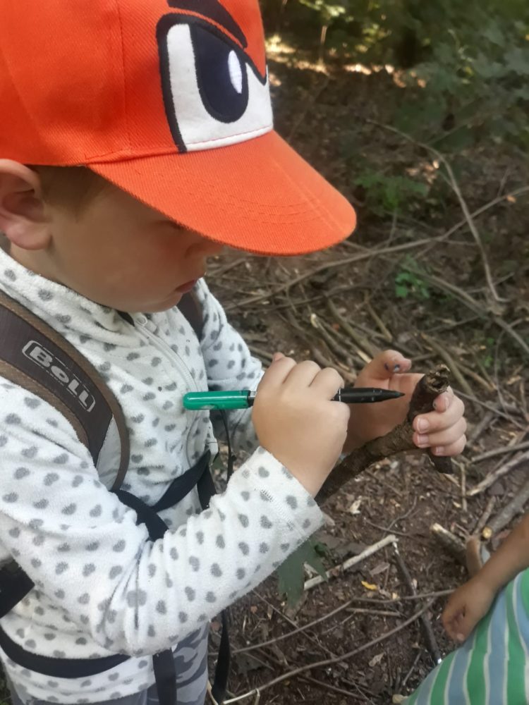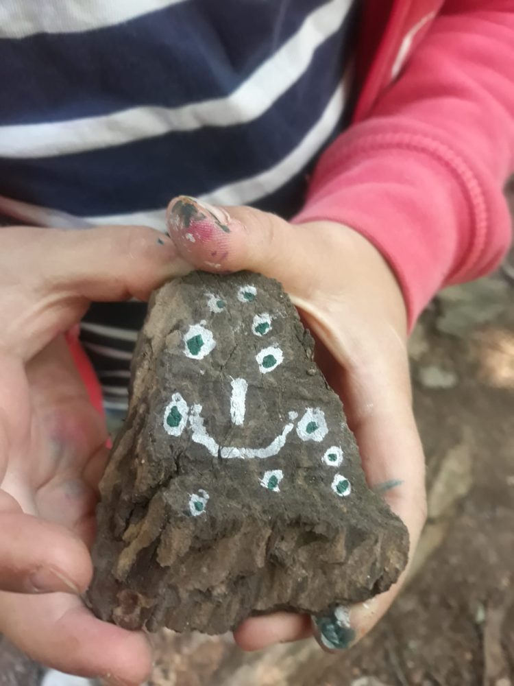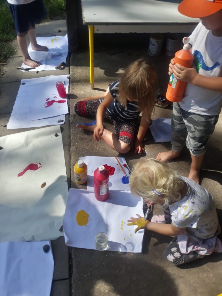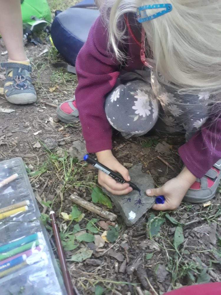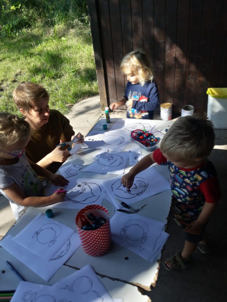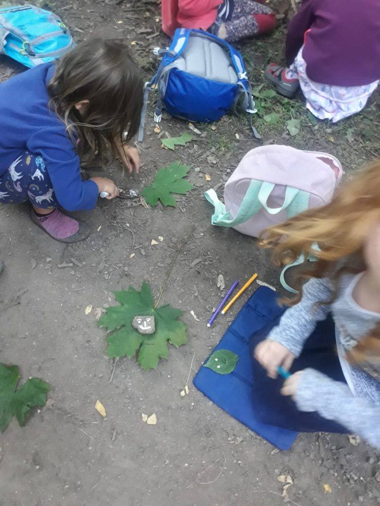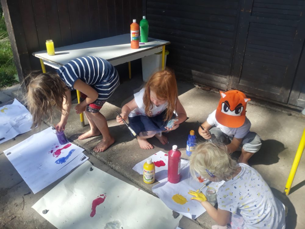 Další den jsme se po našem ranním rituálu s pohybovými říkankami a hrou „Na ježka“ vydali do lesíka za státní školkou. Cestou jsme v trávě pozorovali slimáky nebo si všímali kořenů, které vystupovaly na povrch cesty. Na jednom místě v lesíku jsme se na chvíli „utábořili“ a tvořili jsme kamarády z přírodnin. Děti si pak radostně odnášely svého kámoše z kamínku, z větvičky nebo ze stromové kůry. Odpoledne to v zahradě hýřilo barvami. Temperové barvy byly nejen na papíře, ale i na našich dlaních nebo chodidlech. To jsme totiž tvořili jejich otisky. A podařilo se nám vytvořit i jedno kamarádské srdce 😊.