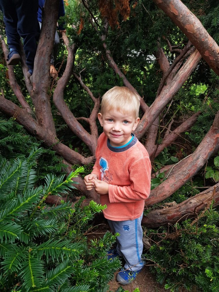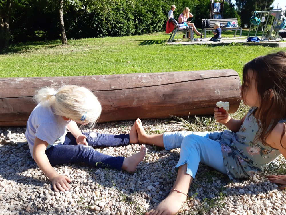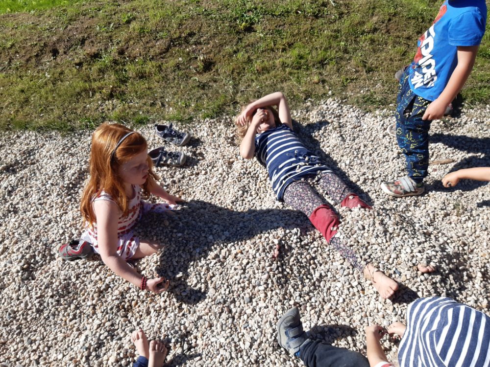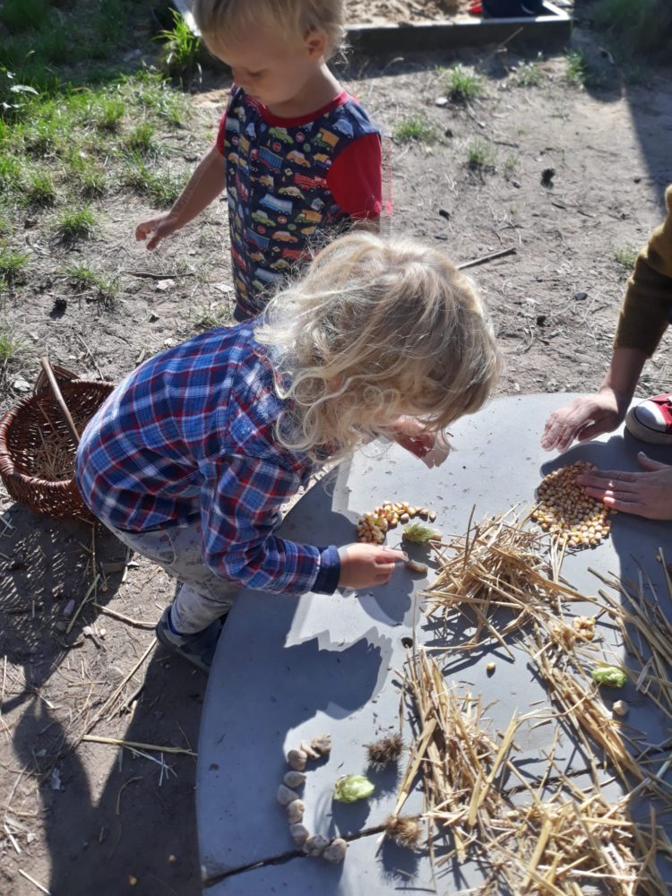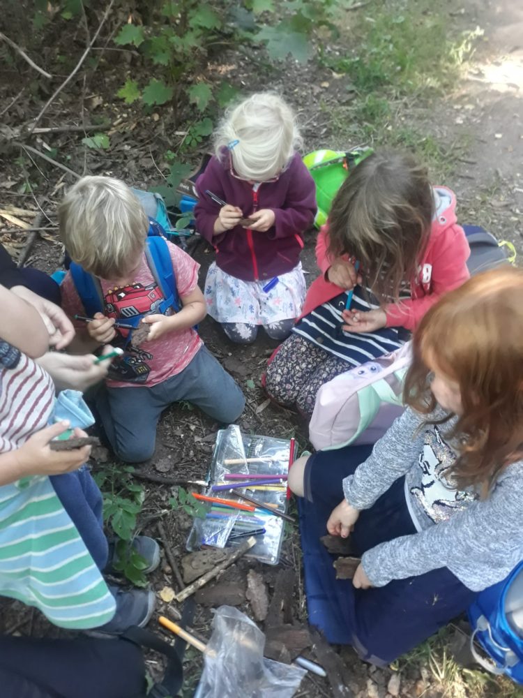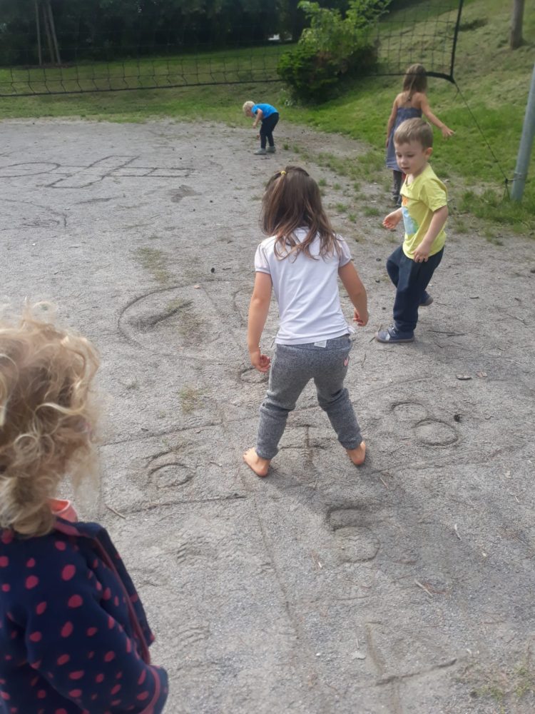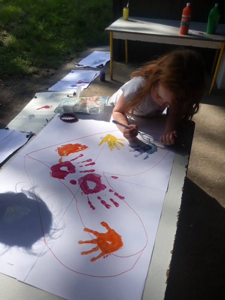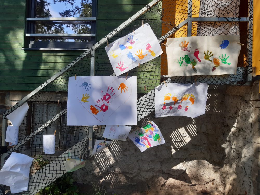 Další den jsme se po našem ranním rituálu s pohybovými říkankami a hrou „Na ježka“ vydali do lesíka za státní školkou. Cestou jsme v trávě pozorovali slimáky nebo si všímali kořenů, které vystupovaly na povrch cesty. Na jednom místě v lesíku jsme se na chvíli „utábořili“ a tvořili jsme kamarády z přírodnin. Děti si pak radostně odnášely svého kámoše z kamínku, z větvičky nebo ze stromové kůry. Odpoledne to v zahradě hýřilo barvami. Temperové barvy byly nejen na papíře, ale i na našich dlaních nebo chodidlech. To jsme totiž tvořili jejich otisky. A podařilo se nám vytvořit i jedno kamarádské srdce 😊.