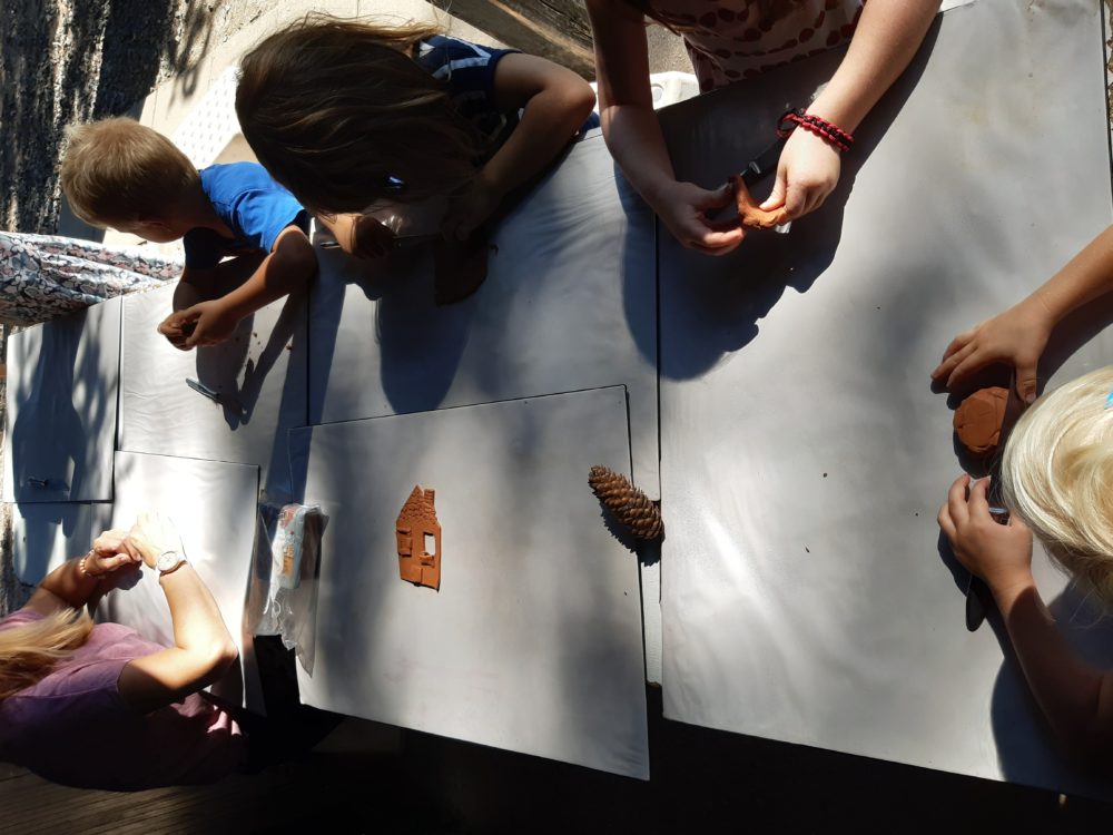 Ve čtvrtek jsme vyrazili „ke skalám“. Po svačince jsme se vrhli na průzkum okolí s lupami, porovnávání velikostí rukou a nohou a nakonec se pustili do stavby domečku pro nás a naše kamarády. Po poobědovém čtení a povídání jsme se vrhli na keramickou hlínu. Tvořili jsme malé napodobeniny našich obydlí a dalších výrobků podle vlastních požadavků.