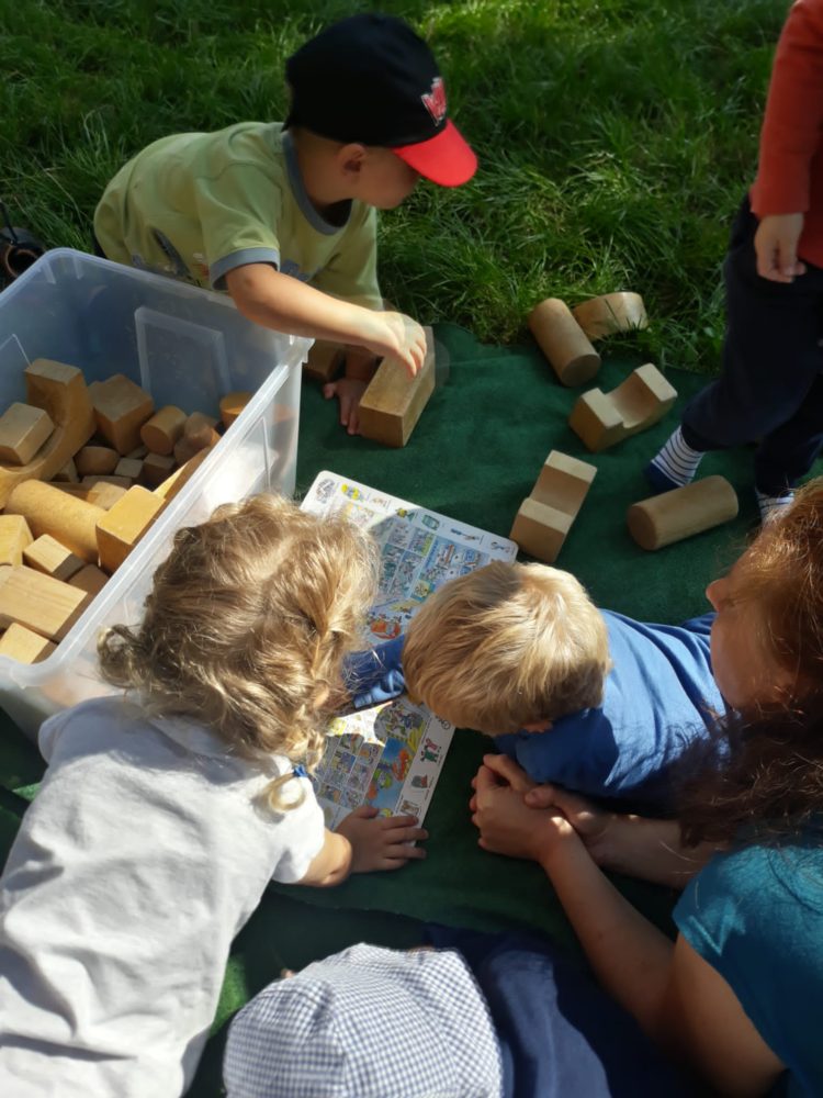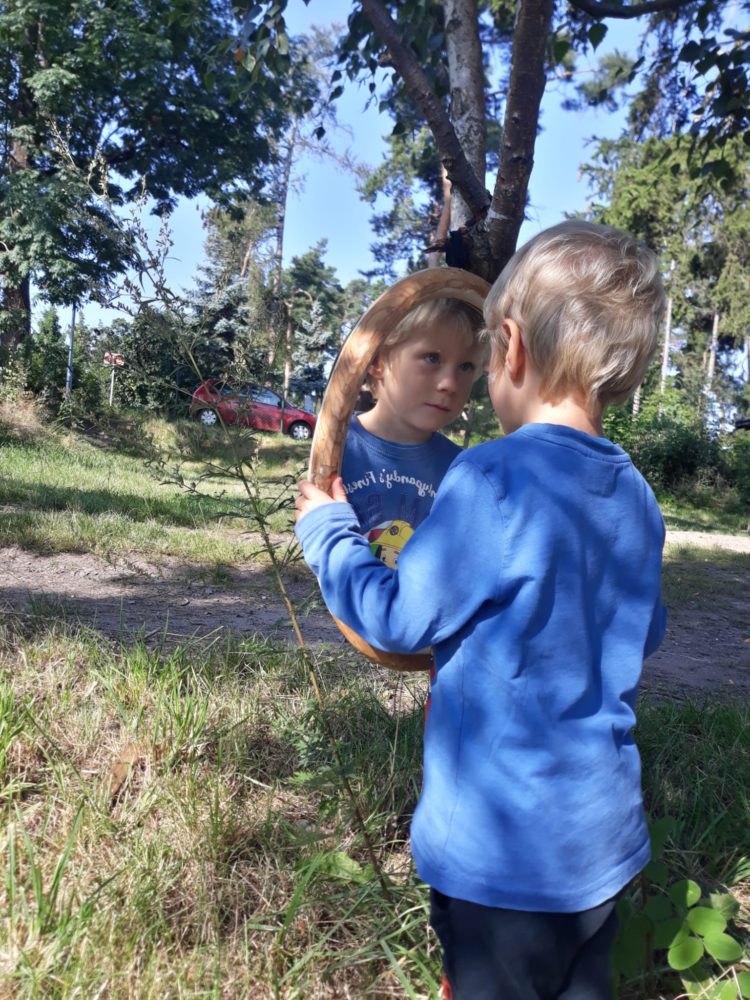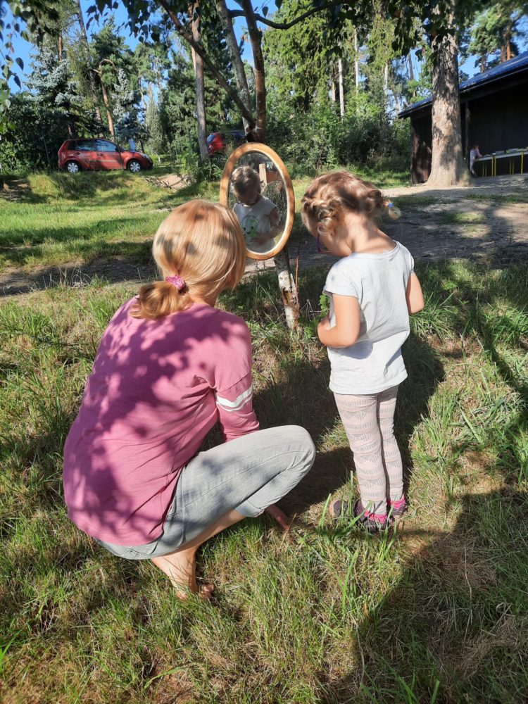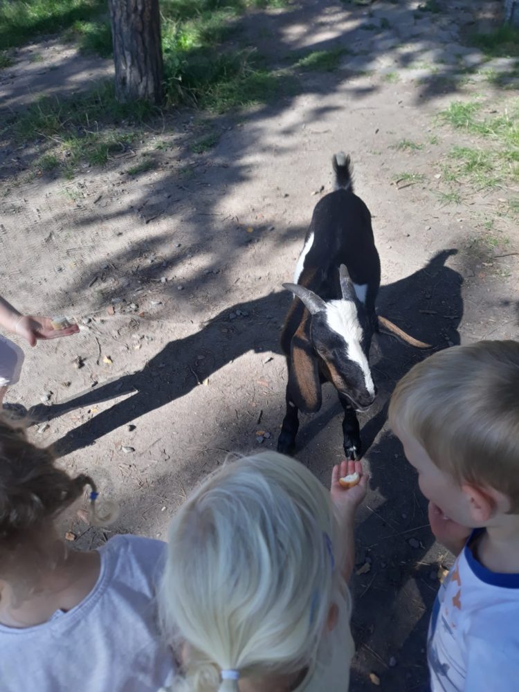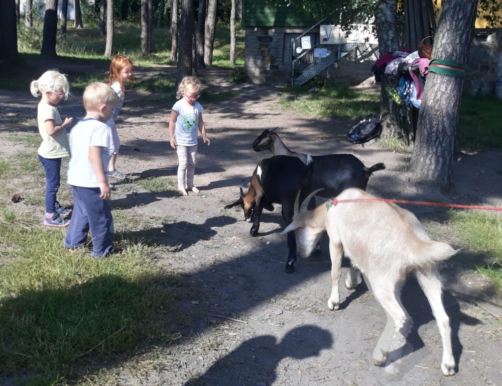 Já a moji kamarádi. To bylo úvodní a hezké téma tohoto týdne. Děti se vzájemně poznávaly při svých volných hrách nebo při společné zábavné hře „deštník“, při které si opakovaly jména kamarádů. O tom, jakou mám barvu očí, vlasů nebo jak to má můj kamarád, nám posloužilo zrcadlo nebo vzájemné pohledy. Děti také tvořily svůj obličej na papíře, kde bylo potřeba doplnit obličejové části. Zábavu si užily i tvoření obličejů nebo dokonce smajlíků z přírodnin. Dopolední část dne jsme zakončili dramatizací tolik oblíbené pohádky Boudo, budko. Nové děti měly nejdříve roli diváka a pak se i zapojovaly. V odpoledních hodinách jsme od tématu odbočili, neb jsme měli kozí návštěvu 😊. Ano, Katka S. k nám do zahrady pozvala sousedku s kozami, které jsme si mohli pohladit, dát jim suché pečivo a pozorovat je při vlastním hledání potravy v celé zahradě. Mééé😊, byl to skvělý zážitek.