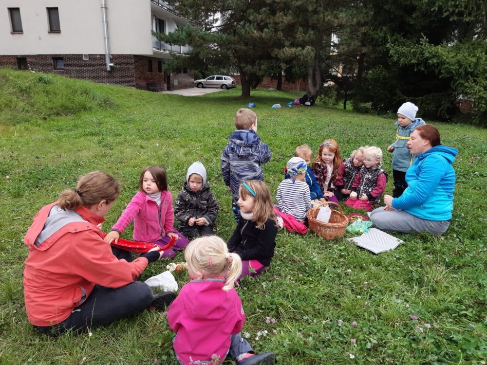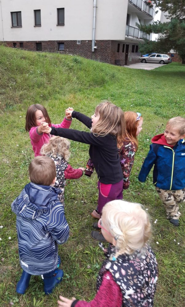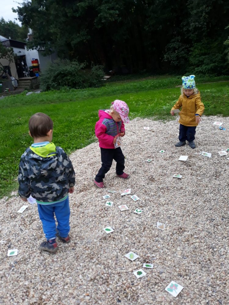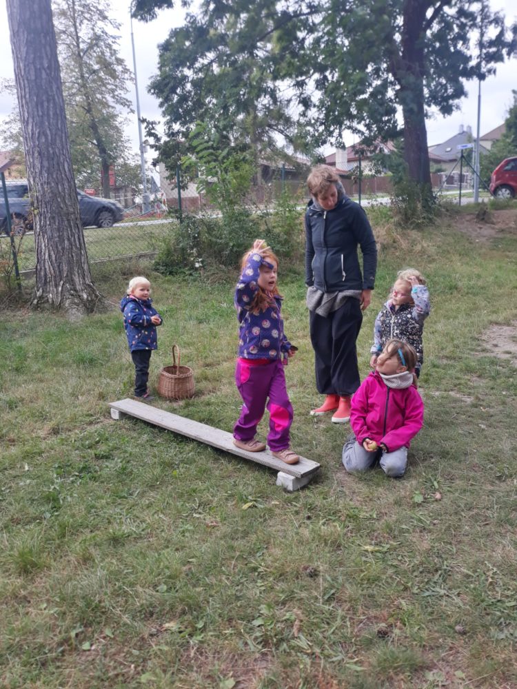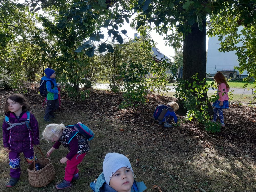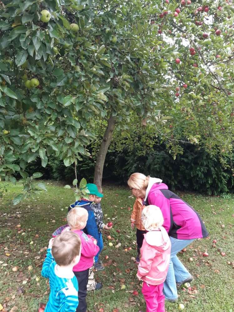 Jablka, hrušky, švestky – byly naším dalším tajemstvím v podzimním košíku. Při pondělním dopoledni u horolezeckých skal se děti nejdříve na obrázkových kartičkách opakovaly názvy podzimních plodů, které potom třídily, počítaly a určovaly první a poslední písmena. Z nich jsme si pro tuto chvíli vybrali jablíčka, které jsme měli k dispozici z blízkých jabloní. Mohli jsme tak vnímat jejich tvar, barvu, vůni nebo je ochutnat. Zkoumali jsme i jablka nahnilá a hledali červíka. Přitom jsme si nezapomněli připomenout vývoj jablka, a i jeho jednotlivé části. Poznávání jsme zakončili u poslechu písničky Koulelo se, koulelo, červené jablíčko, a nakonec jsme si zkusili zatančit mazurku na písničku Měla babka čtyři jabka. Pak jsme se vydali zpátky cestou mezi bytovkami, kde jsme se ještě zastavili u kaštanu, kde jsme našli několik málo kaštanů uzavřených ještě v pichlavé slupce, které jsme také prozkoumali. V odpoledních hodinách si děti oblíbily modelínu, ze které zkoušely vymodelovat nejen jablíčka a hrušky.