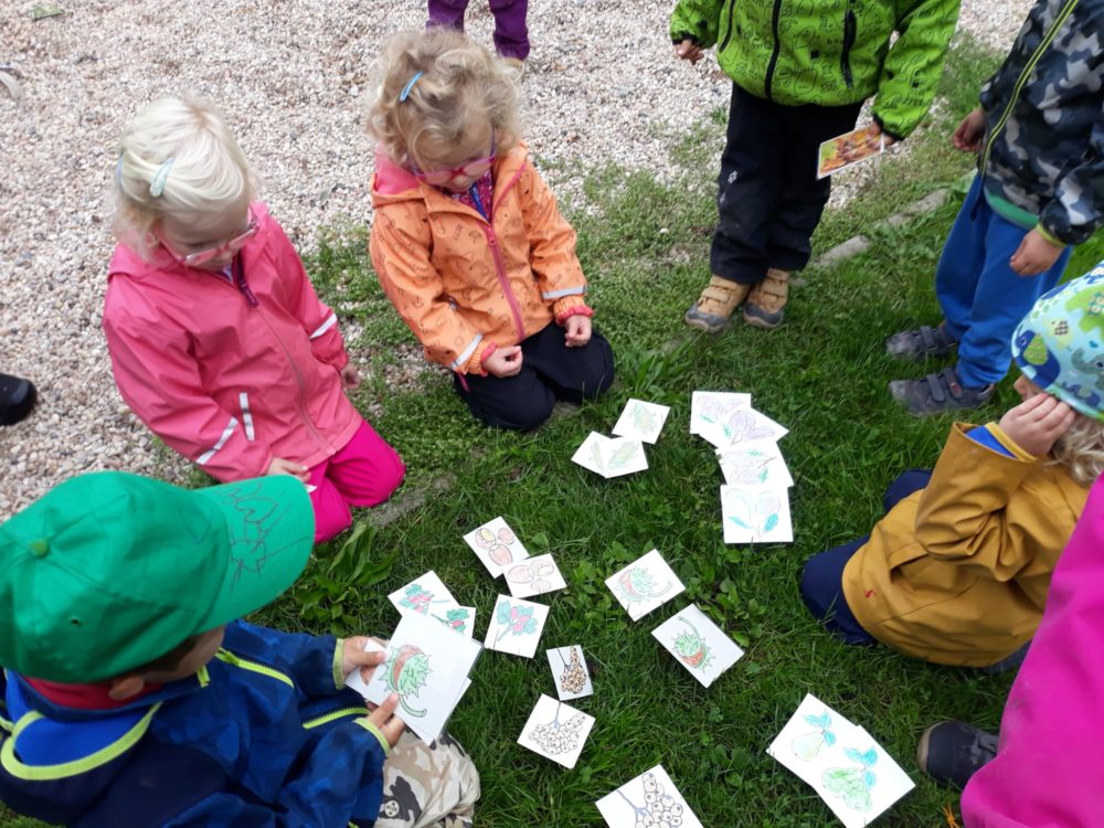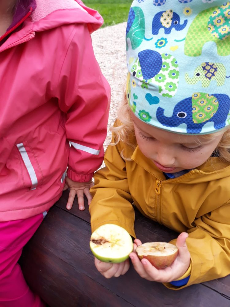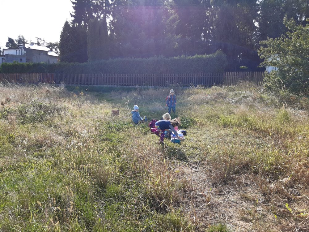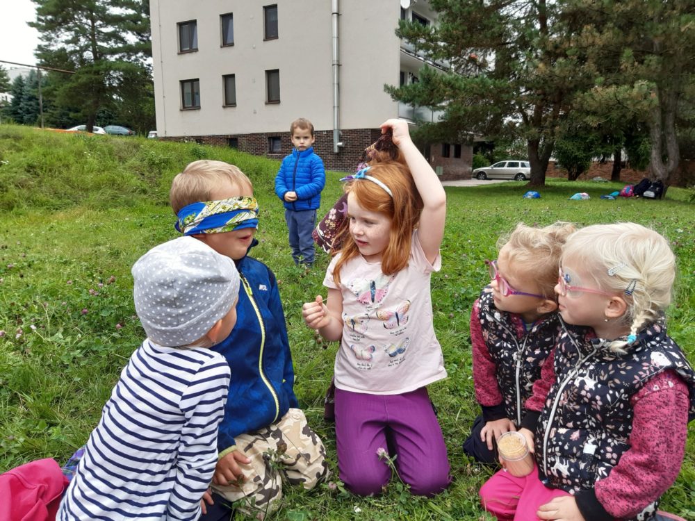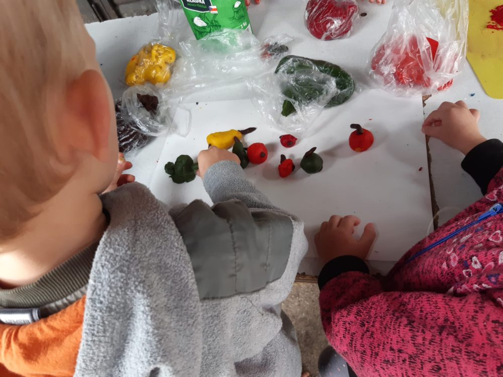 Jablka, hrušky, švestky – byly naším dalším tajemstvím v podzimním košíku. Při pondělním dopoledni u horolezeckých skal se děti nejdříve na obrázkových kartičkách opakovaly názvy podzimních plodů, které potom třídily, počítaly a určovaly první a poslední písmena. Z nich jsme si pro tuto chvíli vybrali jablíčka, které jsme měli k dispozici z blízkých jabloní. Mohli jsme tak vnímat jejich tvar, barvu, vůni nebo je ochutnat. Zkoumali jsme i jablka nahnilá a hledali červíka. Přitom jsme si nezapomněli připomenout vývoj jablka, a i jeho jednotlivé části. Poznávání jsme zakončili u poslechu písničky Koulelo se, koulelo, červené jablíčko, a nakonec jsme si zkusili zatančit mazurku na písničku Měla babka čtyři jabka. Pak jsme se vydali zpátky cestou mezi bytovkami, kde jsme se ještě zastavili u kaštanu, kde jsme našli několik málo kaštanů uzavřených ještě v pichlavé slupce, které jsme také prozkoumali. V odpoledních hodinách si děti oblíbily modelínu, ze které zkoušely vymodelovat nejen jablíčka a hrušky.
