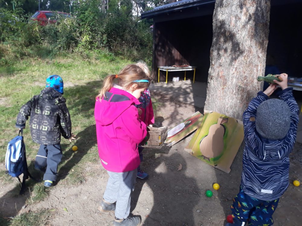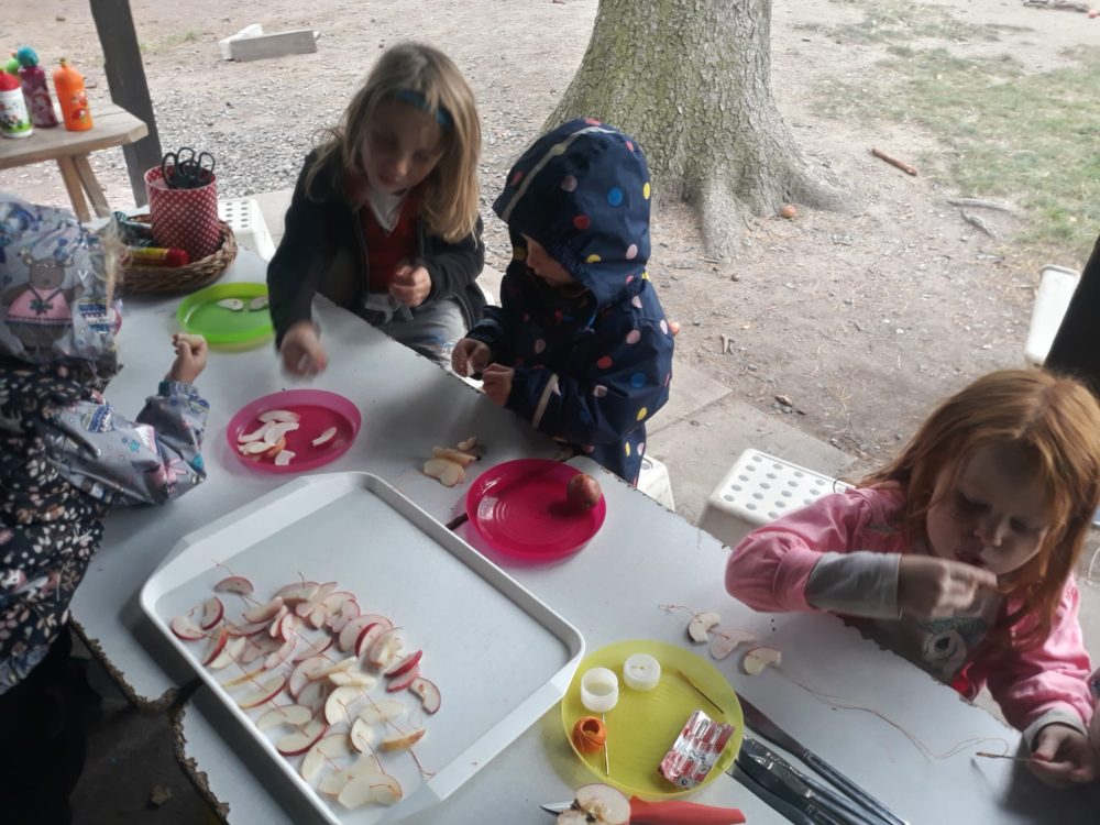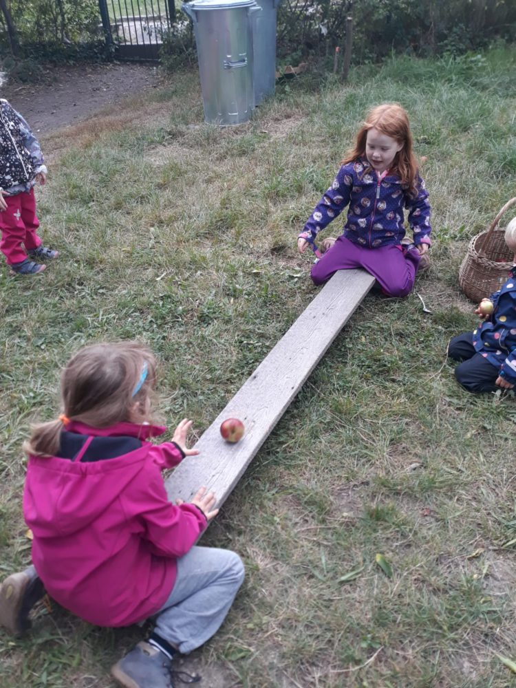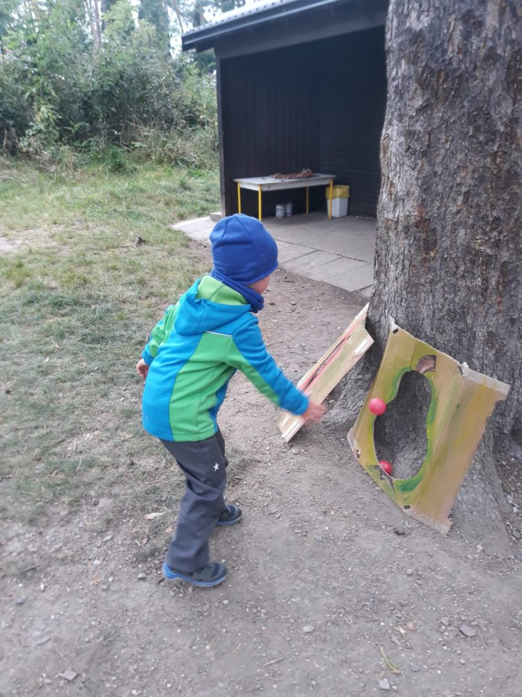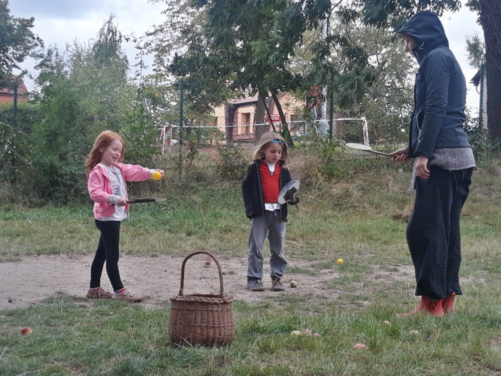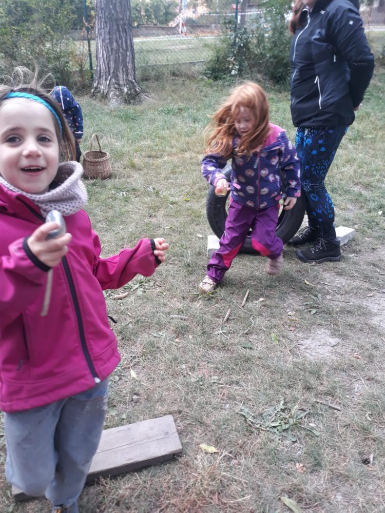Vstávej, vstávej, ratata, podzim ťuká na vrata – nejen tímto popěvkem a s orffovými nástroji v ruce jsme vítali první podzimní den. Zazpívali jsme podzimu také klasické dětské písničky a pak začalo v zahradě malé jablkobraní 😊. Děti měly možnost si vyzkoušet hod míčkem do otvoru jablka nebo hrušky, provlékat jablko šňůrou coby červíkem, nosit jablíčko na lžíci přes překážky tak, aby neupadlo na zem, nebo dokonce nosit jablko na hlavě. Když si děti dosyta užily jablíčkových her, dostaly nápad vyrobit si pálky. A tak se spustila doslova sériová výroba pálek, i když každá pálka byla samozřejmě originální. A pak už se zkoušelo pinkat. Někomu to šlo lépe, někdo teprve přicházel jak na to, ale v každém případě to byla prima zábava. Odpoledne jsme se vrhli na výrobku křížal. Jablíček jsme měli dost, tak děti nejen navlékaly, ale také přitom hodně ochutnávaly😊. Však bylo jablkobraní!