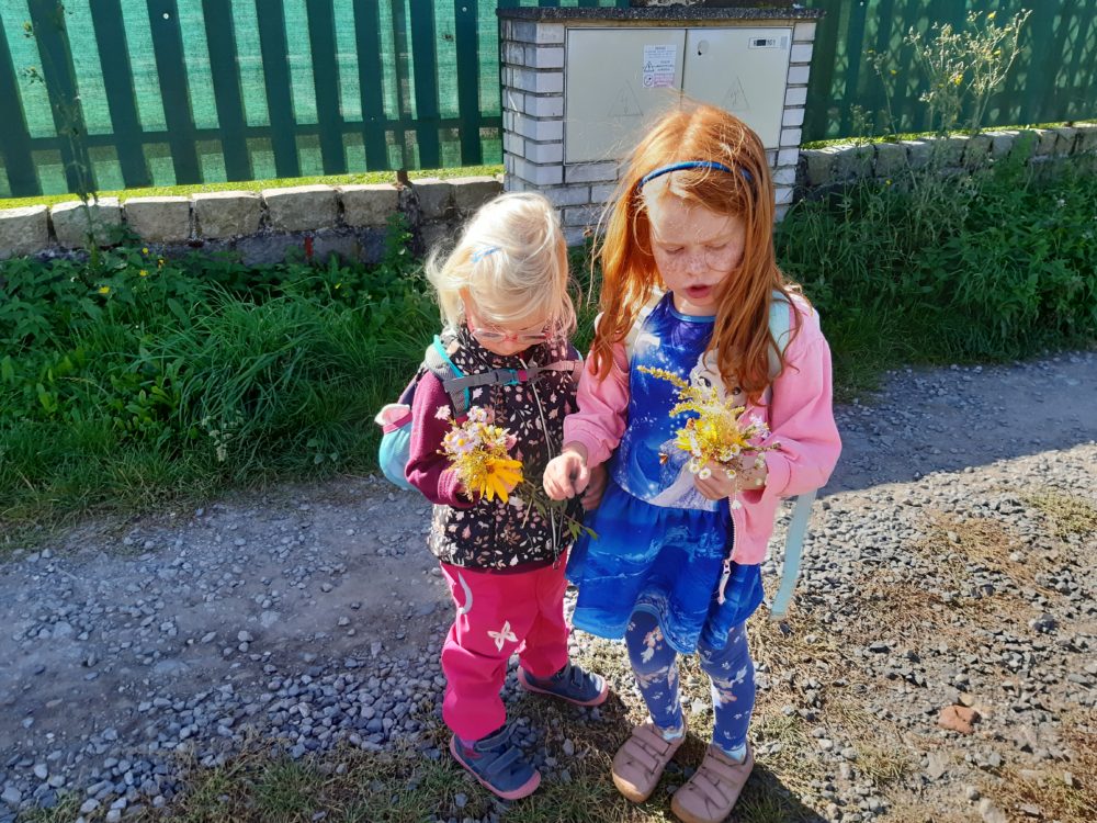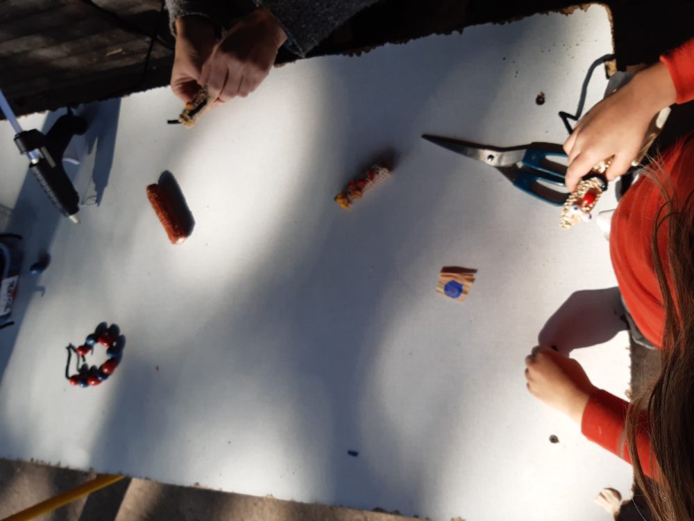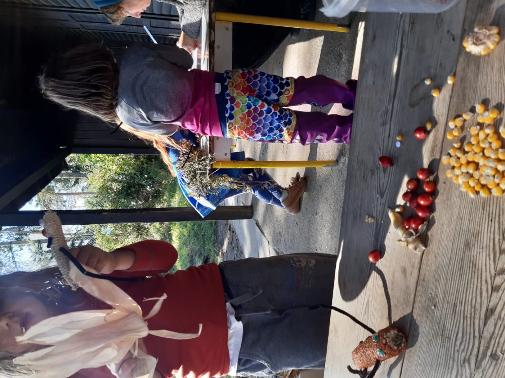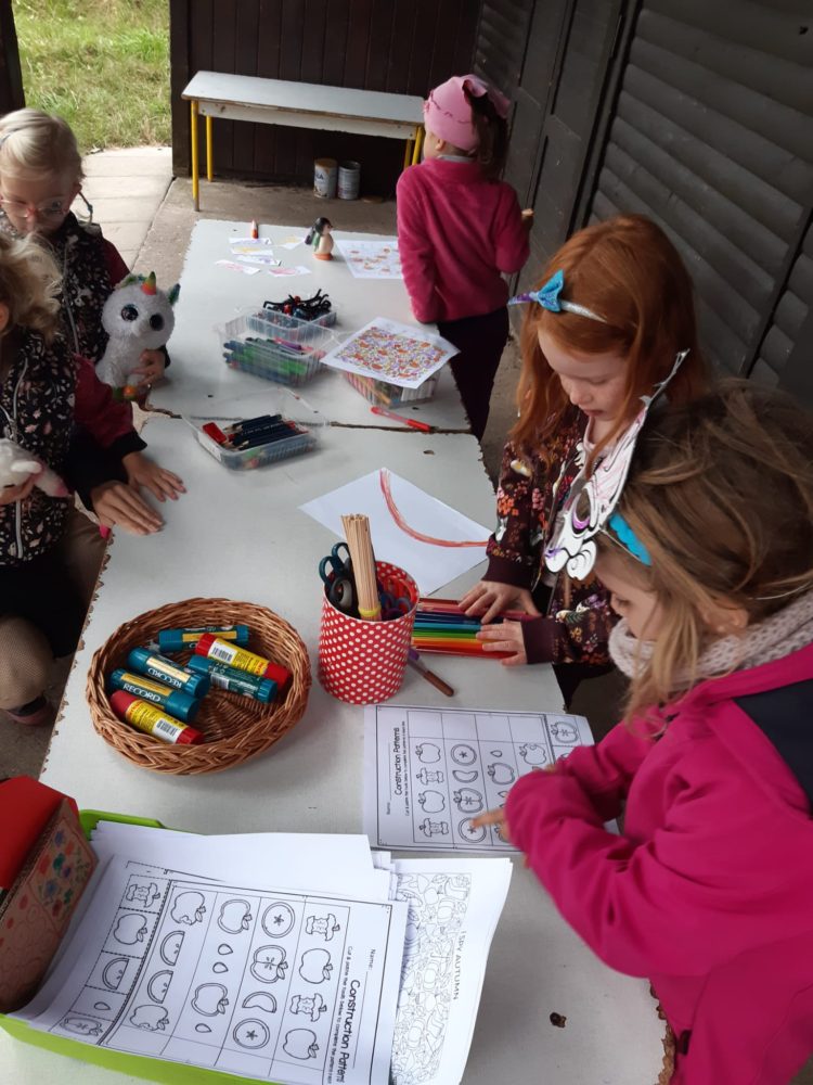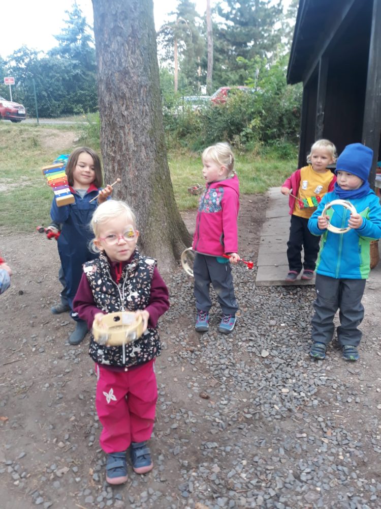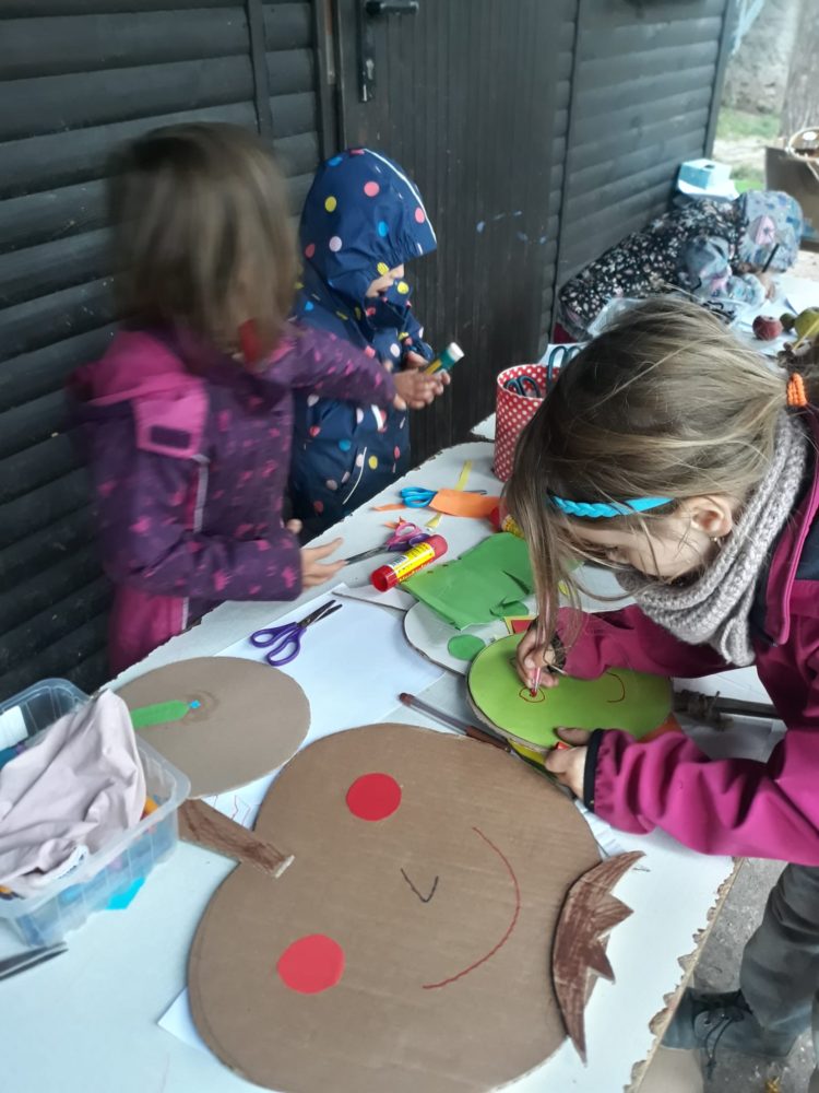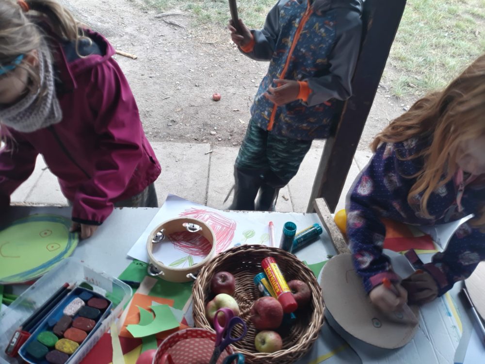 Vstávej, vstávej, ratata, podzim ťuká na vrata – nejen tímto popěvkem a s orffovými nástroji v ruce jsme vítali první podzimní den. Zazpívali jsme podzimu také klasické dětské písničky a pak začalo v zahradě malé jablkobraní 😊. Děti měly možnost si vyzkoušet hod míčkem do otvoru jablka nebo hrušky, provlékat jablko šňůrou coby červíkem, nosit jablíčko na lžíci přes překážky tak, aby neupadlo na zem, nebo dokonce nosit jablko na hlavě. Když si děti dosyta užily jablíčkových her, dostaly nápad vyrobit si pálky. A tak se spustila doslova sériová výroba pálek, i když každá pálka byla samozřejmě originální. A pak už se zkoušelo pinkat. Někomu to šlo lépe, někdo teprve přicházel jak na to, ale v každém případě to byla prima zábava. Odpoledne jsme se vrhli na výrobku křížal. Jablíček jsme měli dost, tak děti nejen navlékaly, ale také přitom hodně ochutnávaly😊. Však bylo jablkobraní!