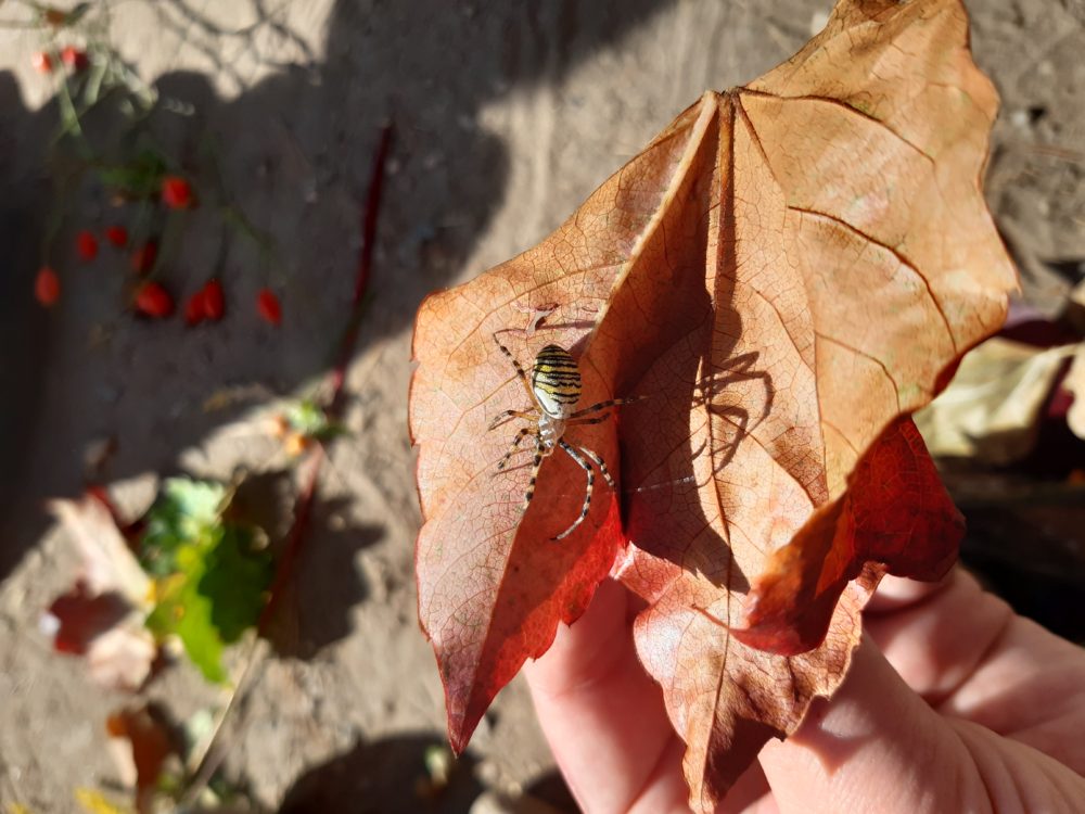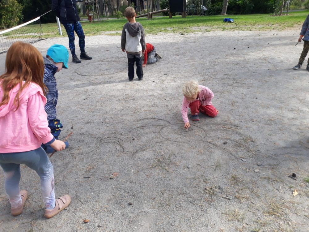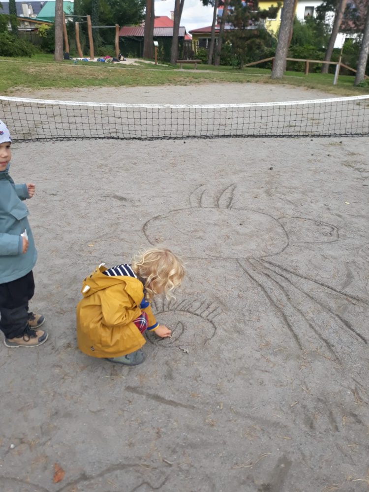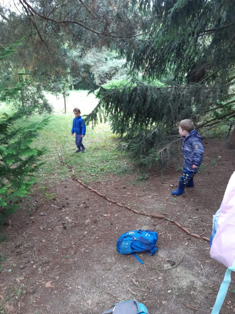 Páteční ráno jsme se opět sešli u podzimního kalendáře, na kterém jsme doplnili první odznak za to, co už jsme stihli – najít žaludy. A protože první podzimní dny mezi nás přišlo příjemné babí léto, pozdravili jsme ho typickými pavoučky, které v těchto dnech poletují na svých pavoučích nitkách. Řekli jsme si, co babí léto znamená a poletující pavoučky si děti vyrobily. Děti poměřovaly nejen délku pavoučích nitek, ale zavěšovaly si je na větve tisu, kde krásně vlály. Nakonec jsme se rozhodli si pavouky nakreslit do hlíny. Mezitím jsme si také zahráli hru Na rybáře a rybičky, čas utekl jak voda a my se vraceli do školky na oběd. Odpoledne ve školce zůstala Lota se Stázkou, které se věnovaly úkolům předškoláka a modelovaly si.
