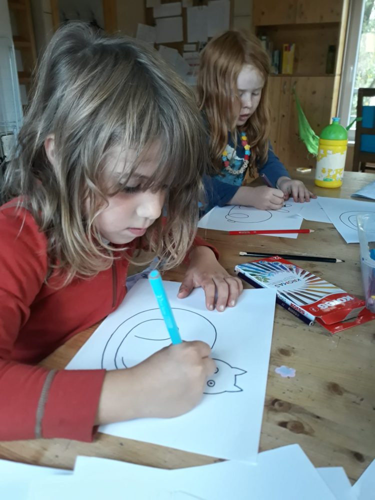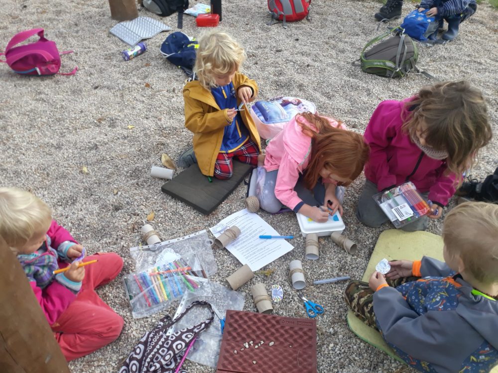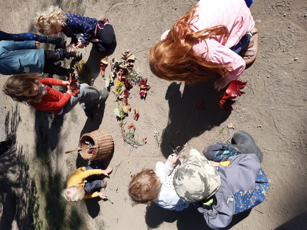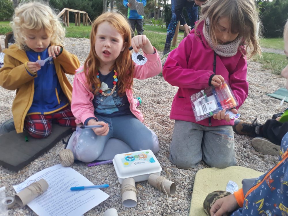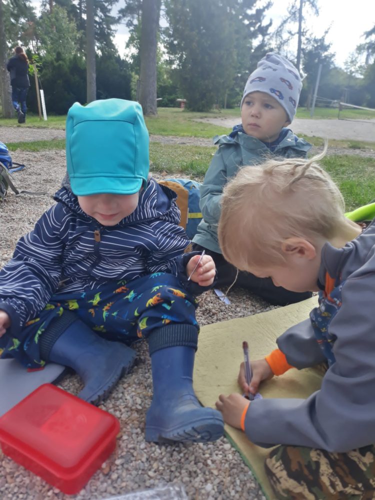Páteční ráno jsme se opět sešli u podzimního kalendáře, na kterém jsme doplnili první odznak za to, co už jsme stihli – najít žaludy. A protože první podzimní dny mezi nás přišlo příjemné babí léto, pozdravili jsme ho typickými pavoučky, které v těchto dnech poletují na svých pavoučích nitkách. Řekli jsme si, co babí léto znamená a poletující pavoučky si děti vyrobily. Děti poměřovaly nejen délku pavoučích nitek, ale zavěšovaly si je na větve tisu, kde krásně vlály. Nakonec jsme se rozhodli si pavouky nakreslit do hlíny. Mezitím jsme si také zahráli hru Na rybáře a rybičky, čas utekl jak voda a my se vraceli do školky na oběd. Odpoledne ve školce zůstala Lota se Stázkou, které se věnovaly úkolům předškoláka a modelovaly si.