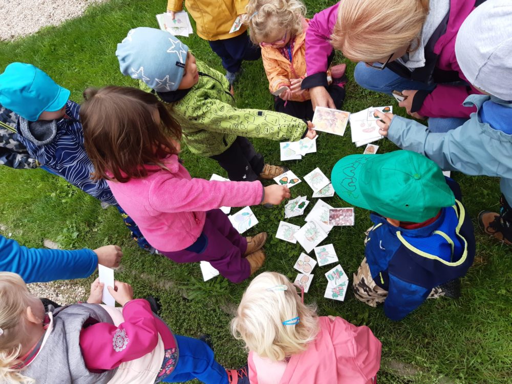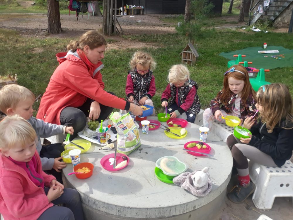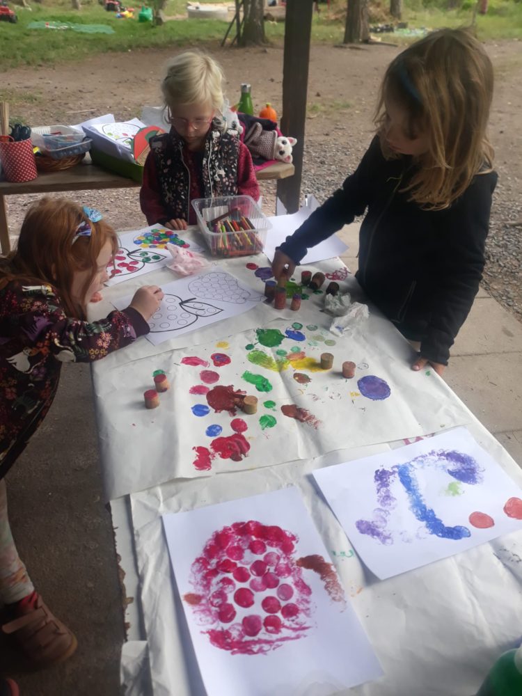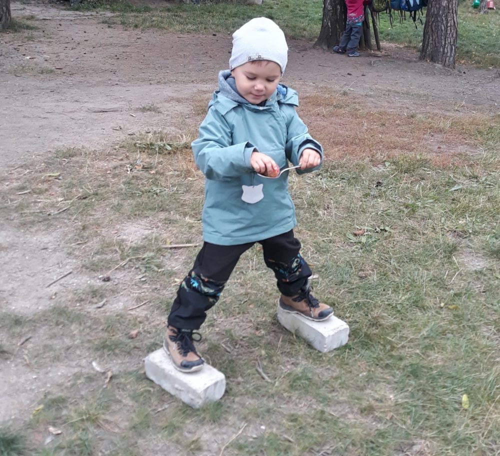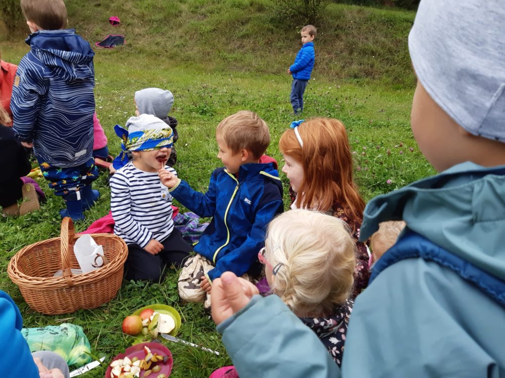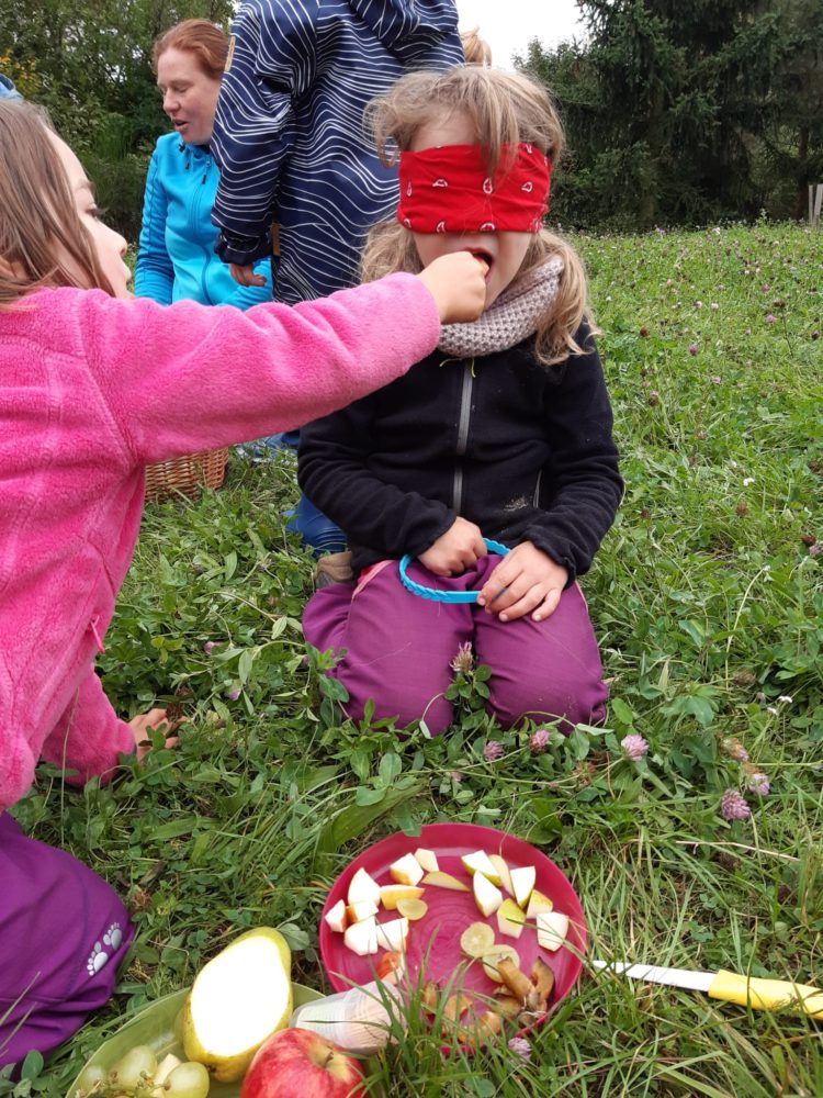 Úterní dopoledne patřilo ochutnávce ovocných plodů. Na travnatém hřišti mezi bytovkami se děti rozdělily do dvou skupinek, ve které každé dítě se zavázanýma očima hádalo, co zrovna ochutnává. V nabídce bylo jablko, hruška, švestka a hroznové víno a nikdo se v určení plodu nespletl. A děti, které zrovna ochutnávat nechtěly, si opodál pod smrky tvořily dlouhatánského hada ze šišek. Dopolední čas jsme si užili také hrou Na babu a u hudebně pohybové hry Zlatá brána nebo válením sudů. Odpoledne jsme trávili ve znamení tiskání podzimních plodů i jiných tvarů korkovými špunty a první samostatnou přípravou svačinky.