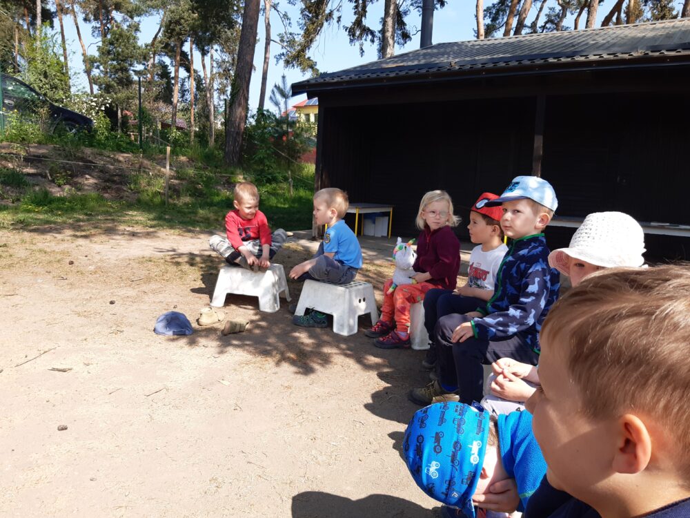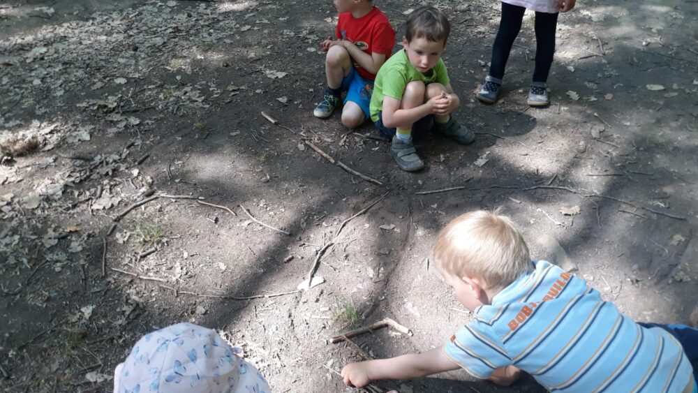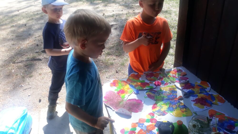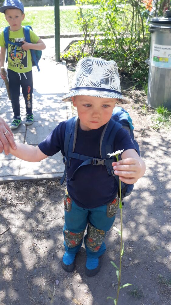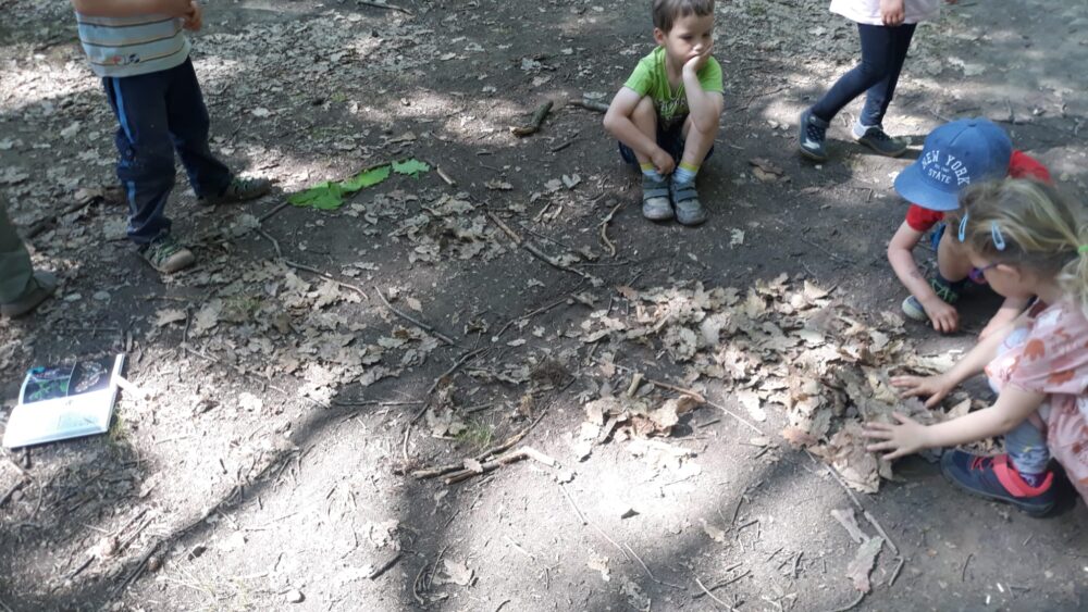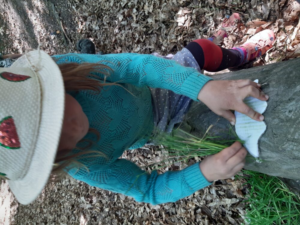Ve čtvrtek jsme se vydali na výpravu do Králičiny. Povídali jsme si o maskovacích schopnostech můr a motýlů. Děti si vyzkoušely zamaskovat takovou můru přímo v terénu. Při zpáteční cestě jsme si zchladili nohy v potoce a přitom objevili žabku, kterou jsme dostatečně prozkoumali a povídali si o ní. Po odpočinku se děti věnovaly volné hře a vznikly nám první herbáře.