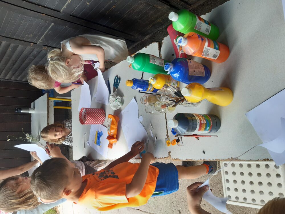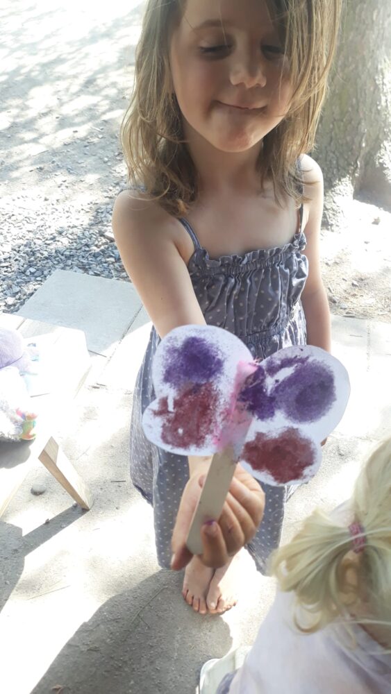 V úterý za krásného slunečného počasí se děti na travnatém hřišti mezi bytovkami stávaly motýly. Dramatizací vývoje motýla se vyzkoušely, jak se z vajíčka stane housenka, která se zakuklí a přemění se na krásného motýla, který odletí na kytičku napít se nektaru 😊. Na zpáteční cestě do školky jsme se ještě zastavili u rozkvetlých kopretin a porovnávali jsme rozdíl mezi ní a sedmikráskou. Odpoledne patřilo výtvarné realizaci motýlích křídel technikou obtisku temperových barev. A ke svačině si děti umíchaly těsto na lívanečky, které si pak mazaly meruňkovou nebo hruškovou marmeládou.