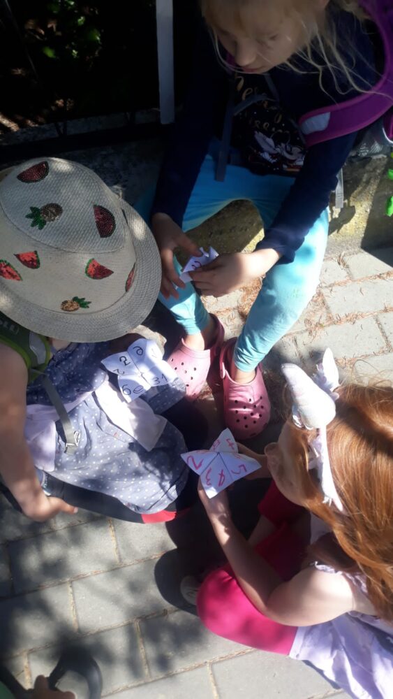 V pátek jsme se vydali procházkou na dětské hřiště v Pařezině. Jako vždy si to tu děti užívaly na houpačkách nebo lanovce a dneska jsme tu také tvořili origami skládačku „nebe, peklo, ráj“. Při výrobě děti na skládačku psaly čísla, kreslily barvy a k nim vymýšlely různé úkoly. Byla to prima zábava, která nám zakončila příjemně prosluněné dopoledne.