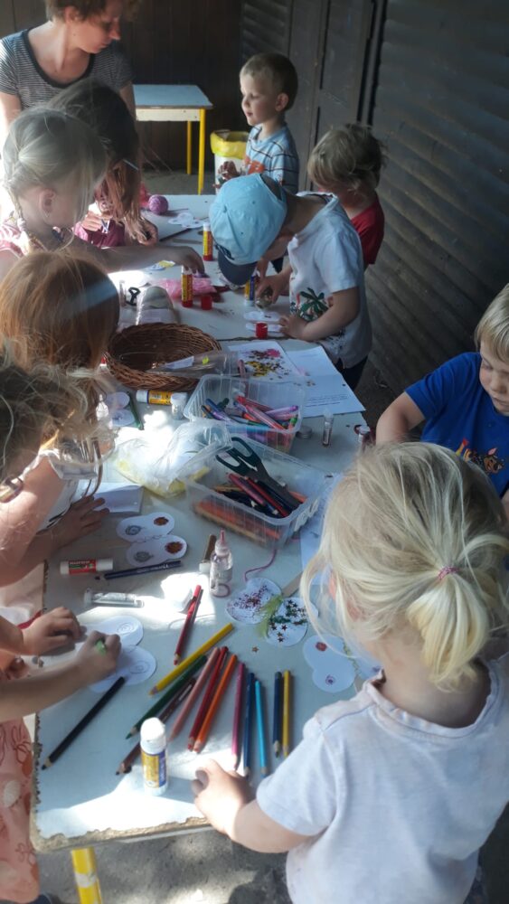 Středeční dopoledne jsme se vydali do klánovického lesa na červený kopec, kde si děti nejen užívali kopcovitého terénu, ale také jsme si povídali o můrách a jednu jsme z přírodnin ve stylu land art vytvořili. Na dubových listech jsme také objevili spoustu čerstvých duběnek. K polednímu čtení jsme si vzali knížku s pěknými příběhy motýla Emanuela a makové panenky a pak si děti vytvořily motýly ze špachtle a papírových motýlích křídel, kterým dodávaly kouzlo třpytky.