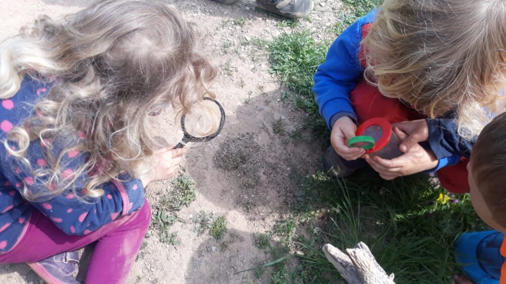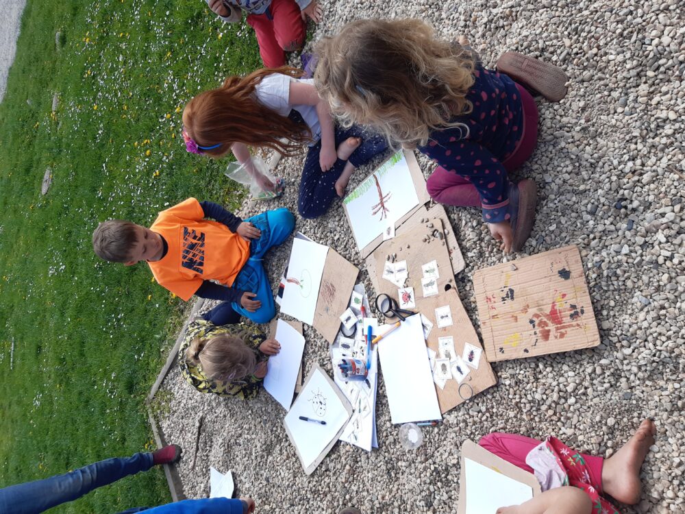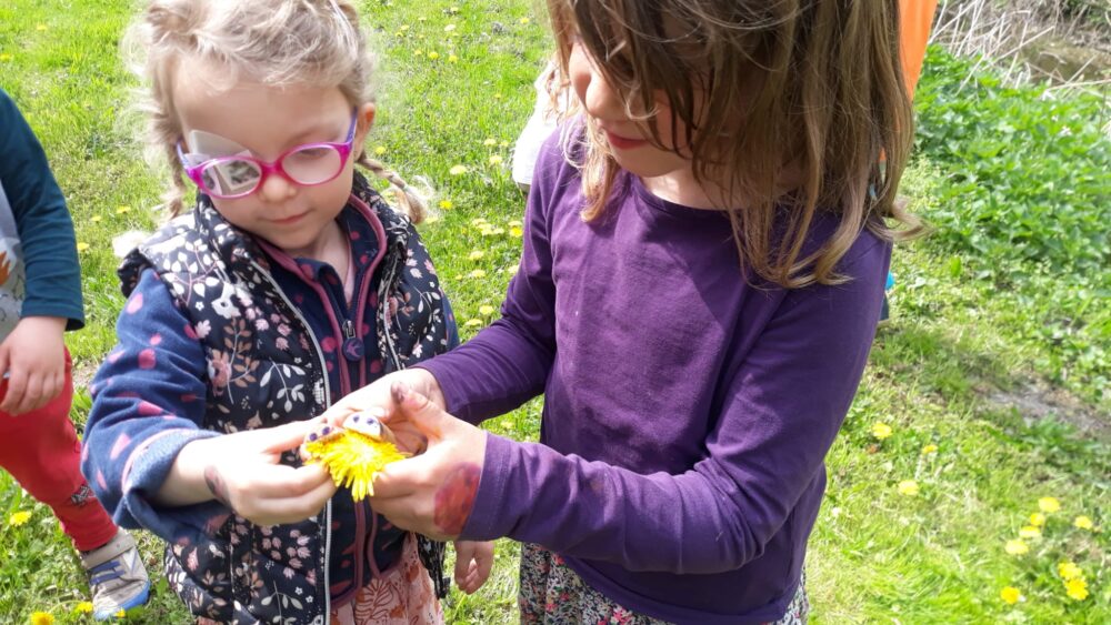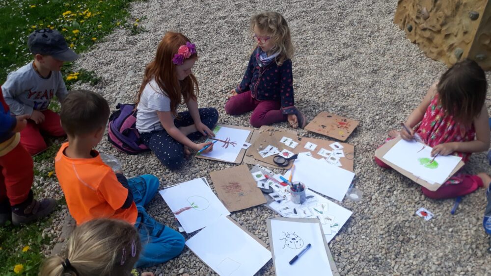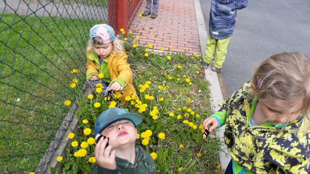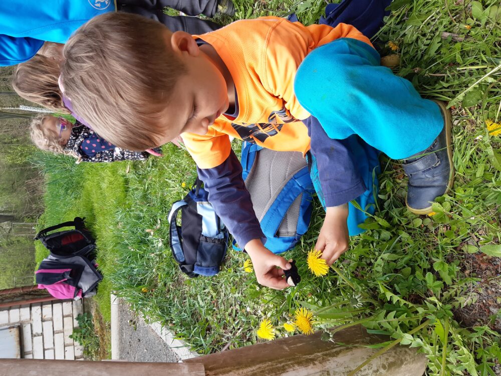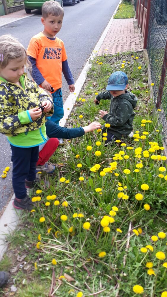 První květnový týden nás provázeli mrňouskové z hmyzí říše, nejvíce však včelky, které teď na jaře mají hodně napilno. Při pondělku u horolezeckých stěn ale děti nejdříve zaujalo spoustu pampelišek, ze kterých si holčičky hned pletly věnečky. Děti také sbíraly do košíku květy pampelišek, abychom si z nich připravili sirup. A protože v přírodě je všechno tak přirozeně propojené, tak jsme hned při sbírání květů pozorovali včelky. Pak se nám na hromadě hlíny naskytla možnost pozorovat mravence. Pod lupou děti zjišťovaly, kolik má nohou a tykadel. Nakonec jsme si prohlíželi některé zástupce z hmyzího světa na kartičkách pexesa a kreslili jsme je. Při návratu do zahrady jsme připravili z pampeliškových květů základ pro sirup a dali do druhého dne vyluhovat. Slunečné odpoledne jsme kreslili obrázky obtiskem listů pampelišek a jejich květů za pomocí temperových barev. Vznikaly hezké a veselé výtvory.