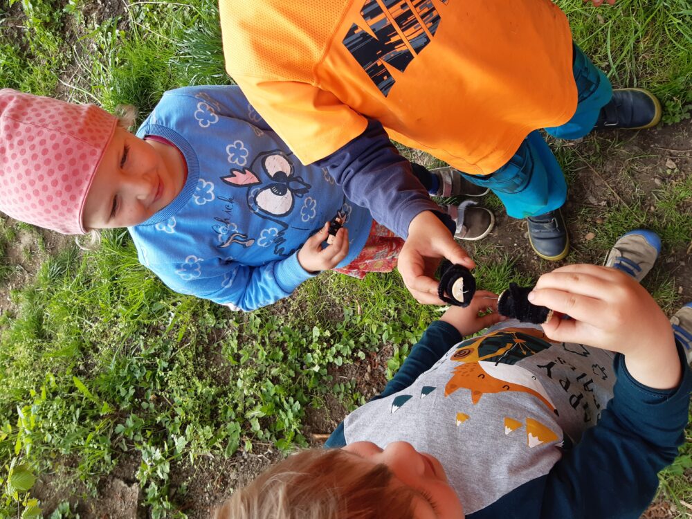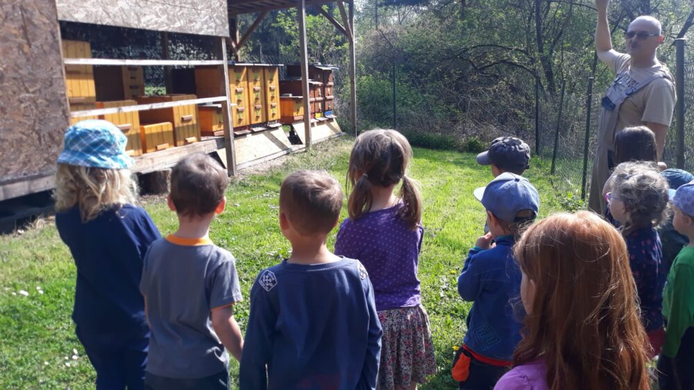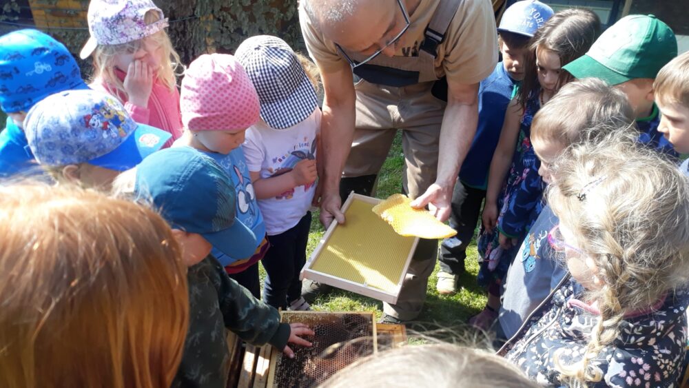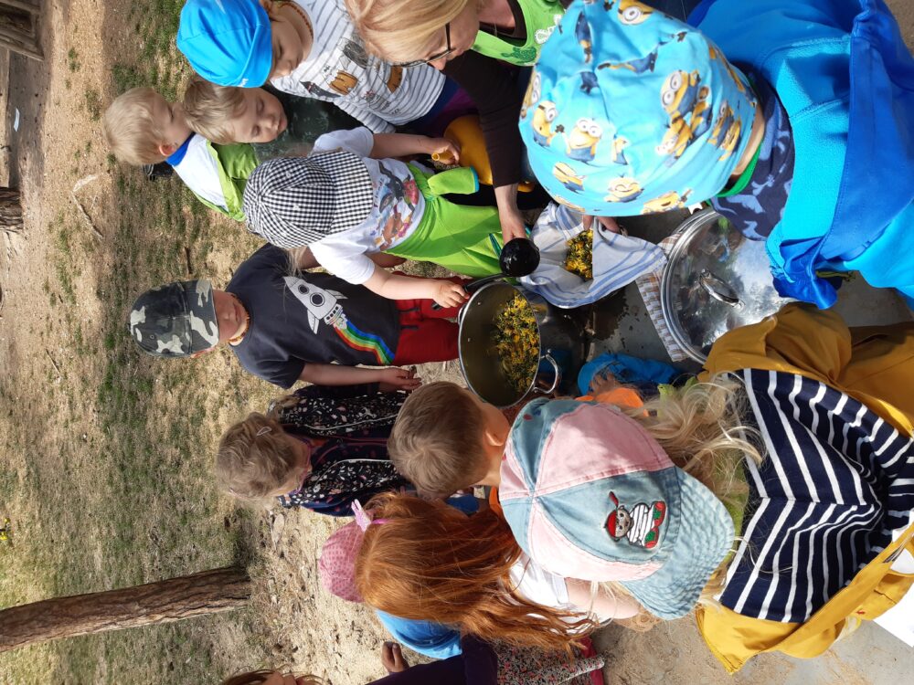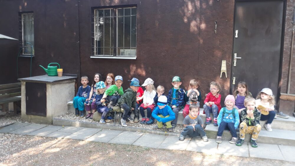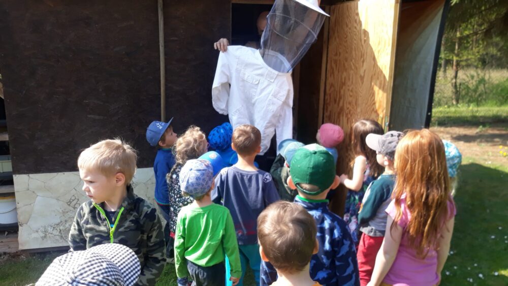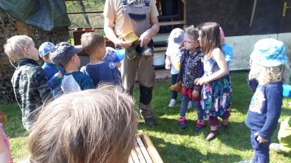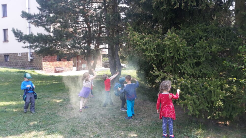 Středeční dopoledne jsme byli za včeličkami p. Vlase, který měl pro nás připravené nejen zajímavé povídání o tomto užitečném hmyzu s ukázkami pláství a úlů, ale viděli jsme i včelařský ochranný oblek, doutnák nebo jak se sbírá z pláství med. Na zpáteční cestě do školky děti v lesíku objevily ruměnice a u travnatého hřiště opět neodolaly pampeliškám na pletení věnečku. Velký zážitek jsme měli také z objevení pylu na kvetoucím smrku, kterého bylo s překvapením opravdu hodně. Kdo stál na blízku, měl napudrovaný nejen celý obličej, ale i oblečení nebo batoh 😊. Po obědě jsme si četli příběhy včelích medvídků a odpoledne se neslo v duchu volných her.