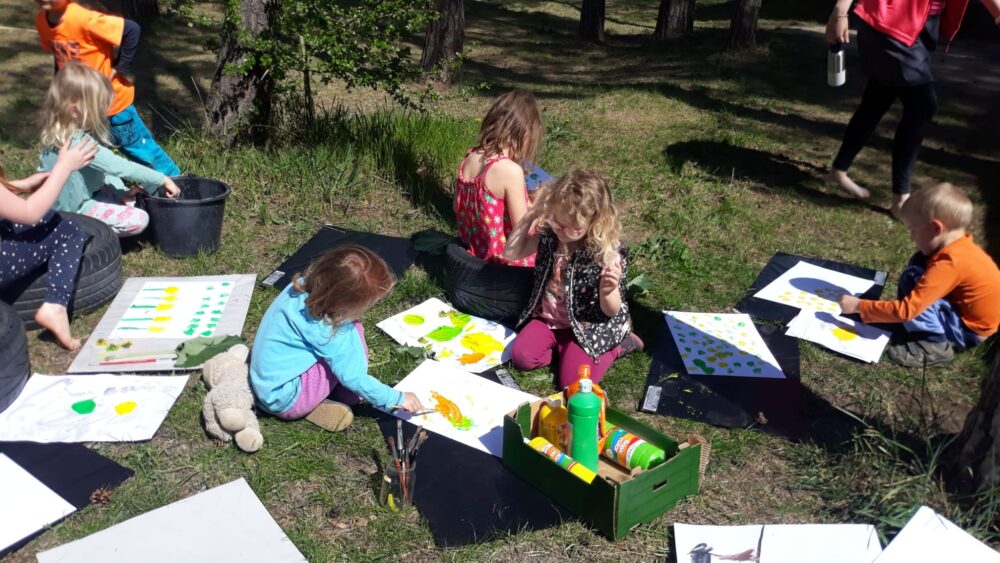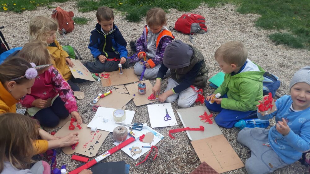 Páteční dopoledne jsme trávili v parku, kde si děti nejen užívaly her v oblíbených keřích tisu, houpačky, klády nebo provazové prolézačky, ale také jsme vyráběli srdíčka pro nedělní Den matek. Odpoledne jsme si četli Toma a Jerryho, a potom jsme malovali tuší a vodovými barvami. Nakonec se u studny plných pískových dobrot konala oslava.