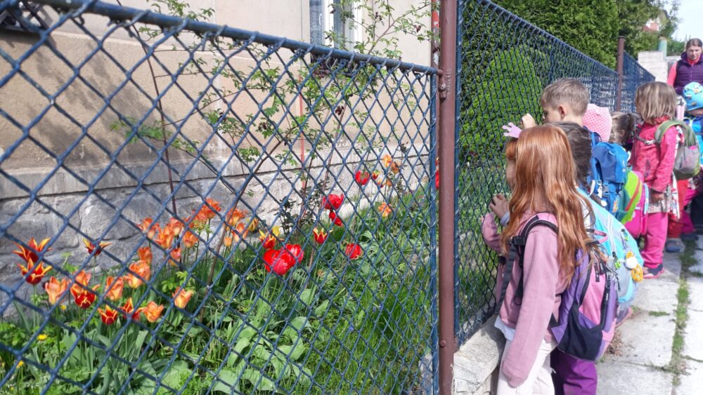 Při čtvrtečním setkání v pískovišti jsme si vyprávěli o návštěvě včelaře a o včele samotářce. Následně jsme se vydali k Výmole pod školu na rákos, abychom mohli vyrobit z plechovek domečky pro včelky samotářky a jiný hmyz. Po cestě jsme pozorovali rozkvetlé rododendrony, tulipány a modřence v zahradách. Bohužel nás ještě před svačinkou přepadl déšť a tak jsme se z náměstí zavítali zpět do zahrady školky. Po obědě si déti vybraly ke čtení příběhy Macha a Šebestové. Odpoledne jsme se pustili do revitalizace záhonku s jahodami a začali se těšit na jejich úrodu.